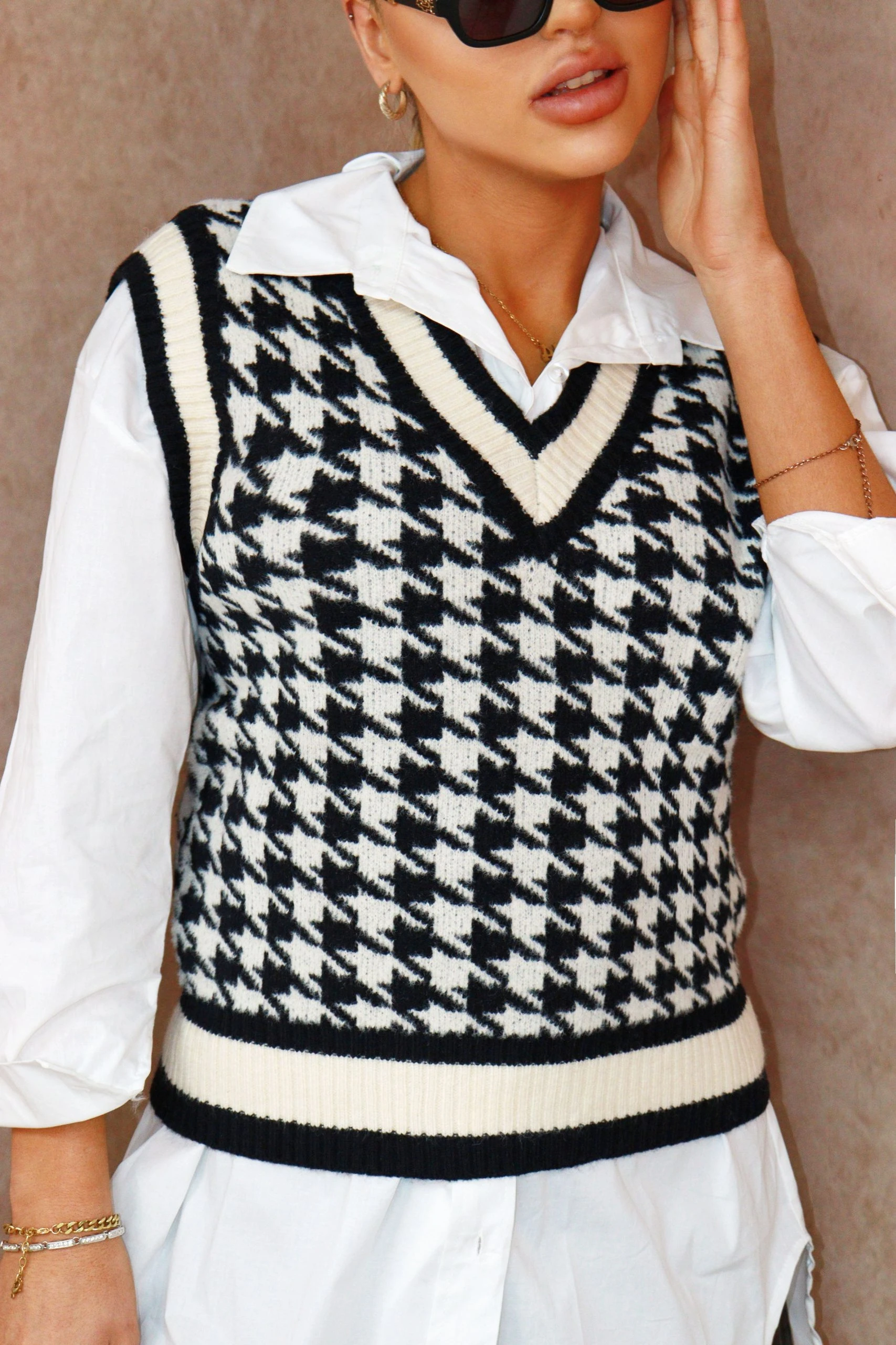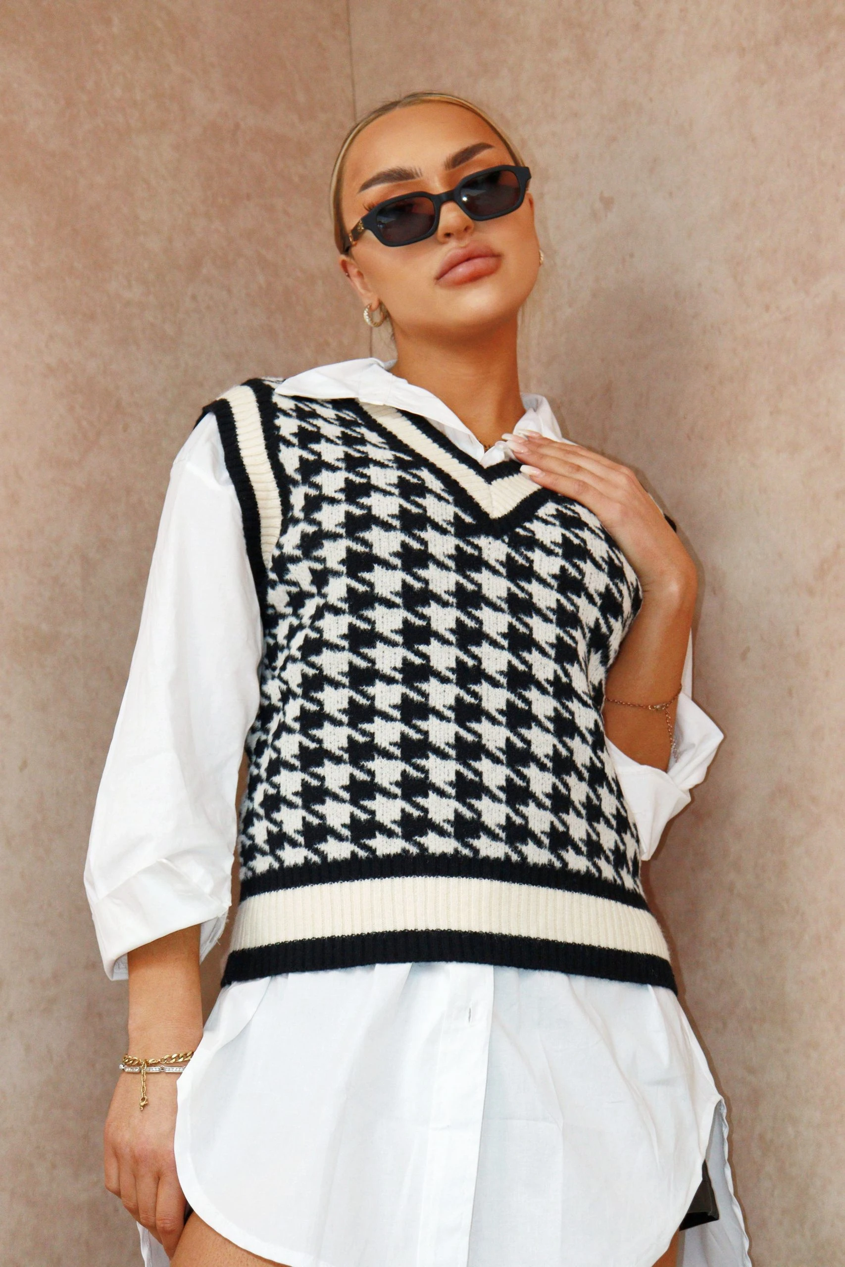 Step up your winter wardrobe with our dogtooth knitted vest babe. Featuring a knitted material, dogtooth design, v neckline, slightly oversized fit and knitted fabric. Style with an oversized shirt and knee high boots for the perfect A/W city look.