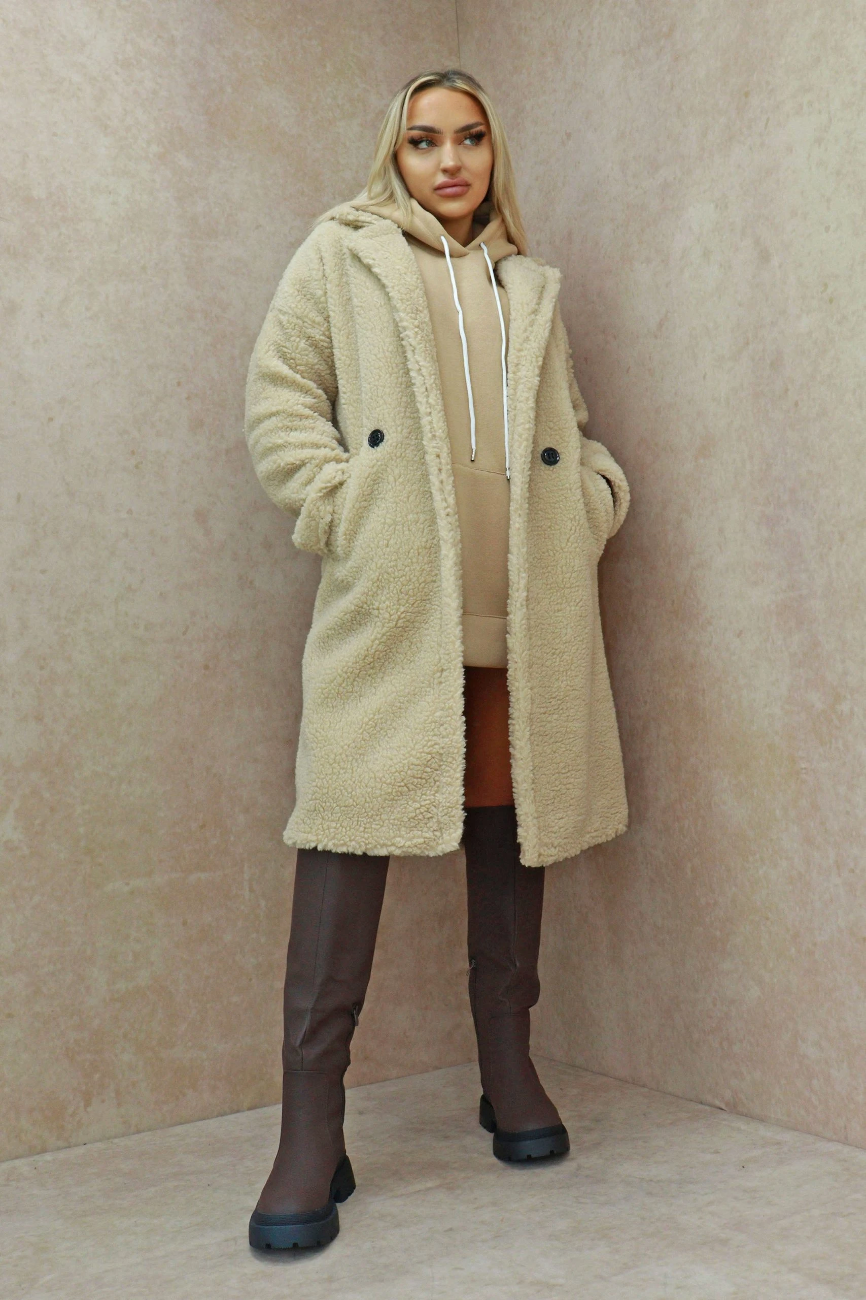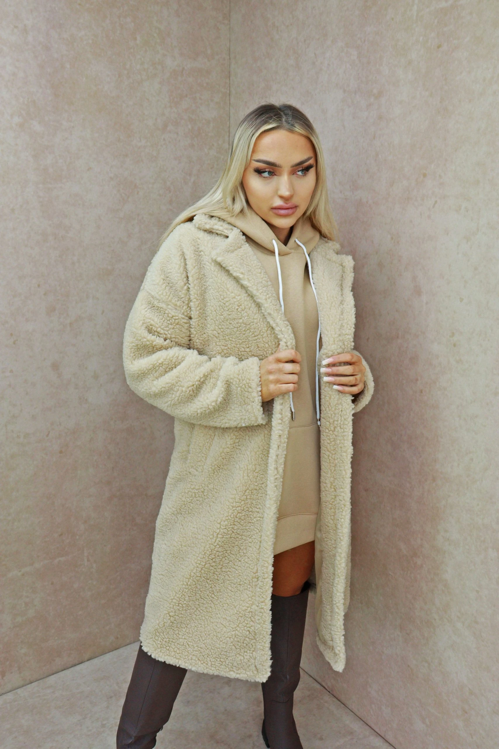 Stay warm and stylish this winter with this longline teddycoat. Featuring a borg finish, oversized fit and longline length this is the perfect winter coat babe. Style with knee high boots and a leather skirt for a stylish daytime look we love.