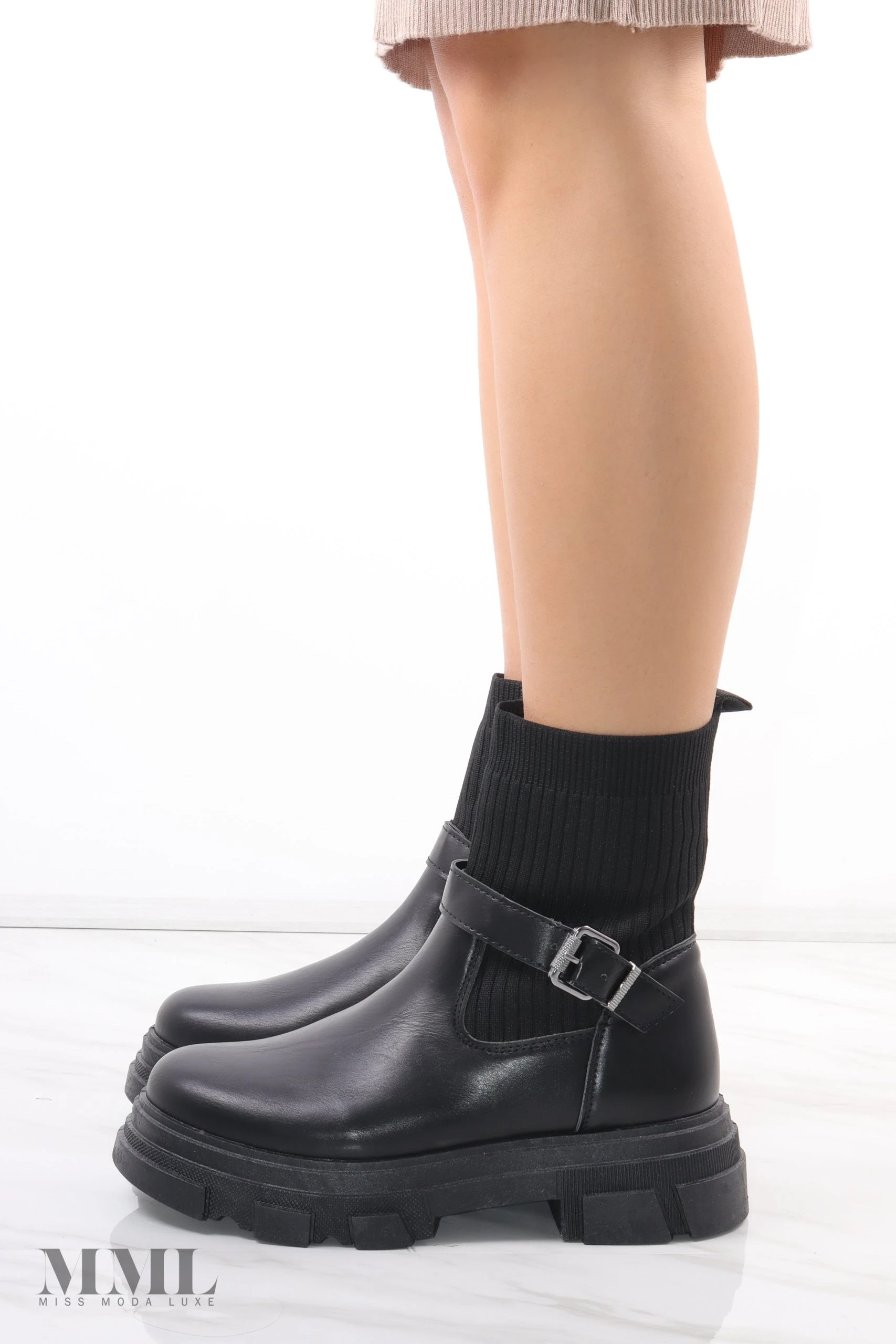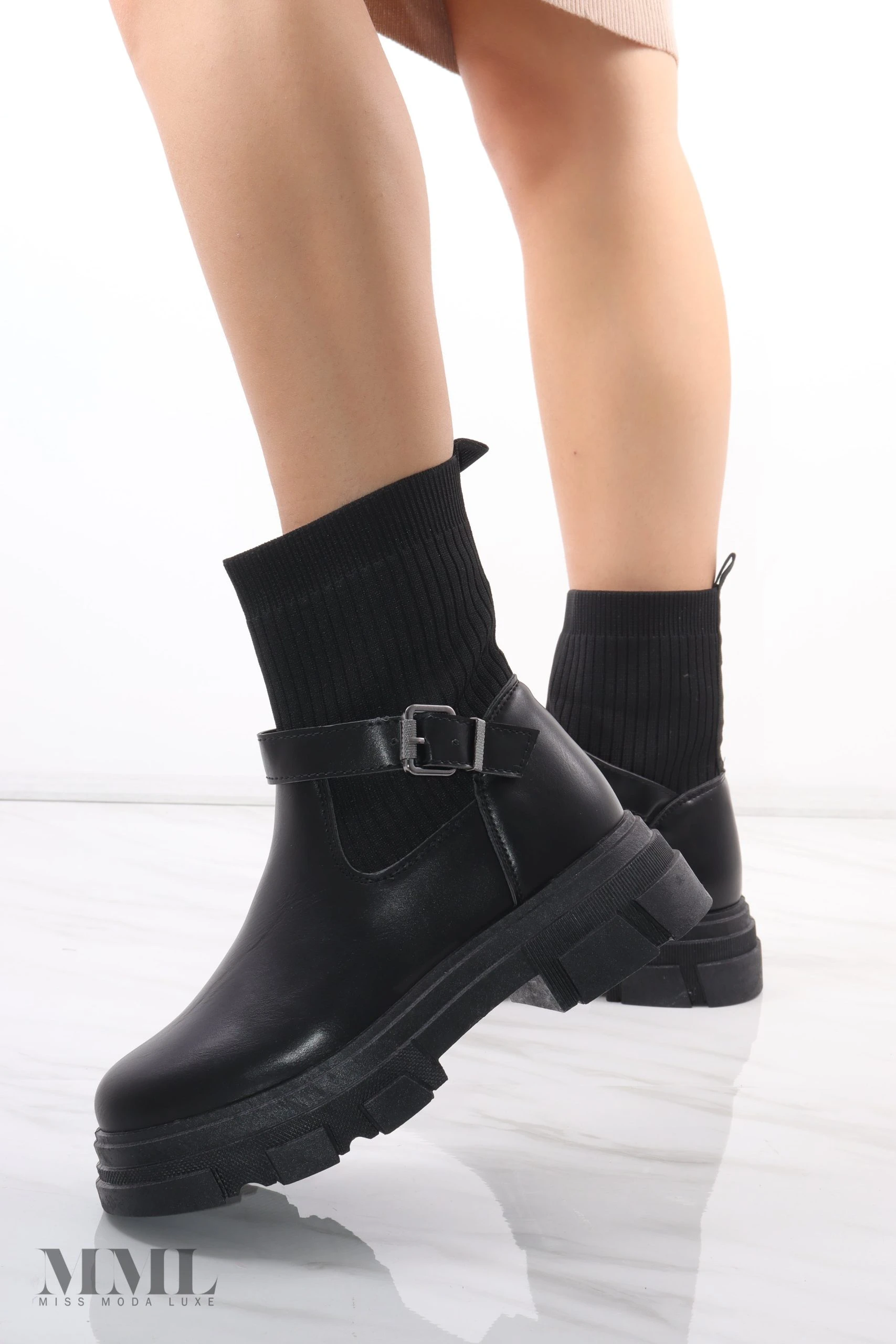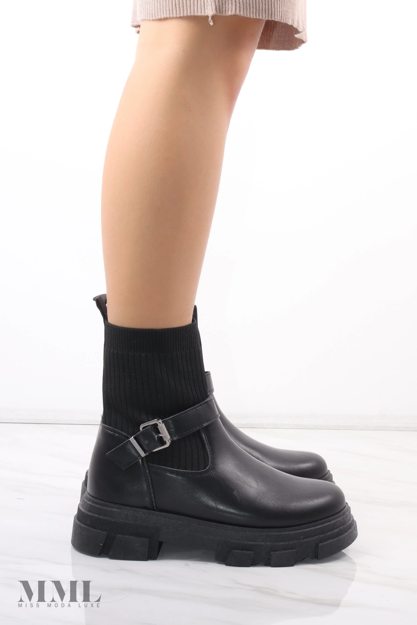 Autumn must have. Sock boot with faux leather base. Chunky soul with a buckle strap around the ankle. Slip on style.