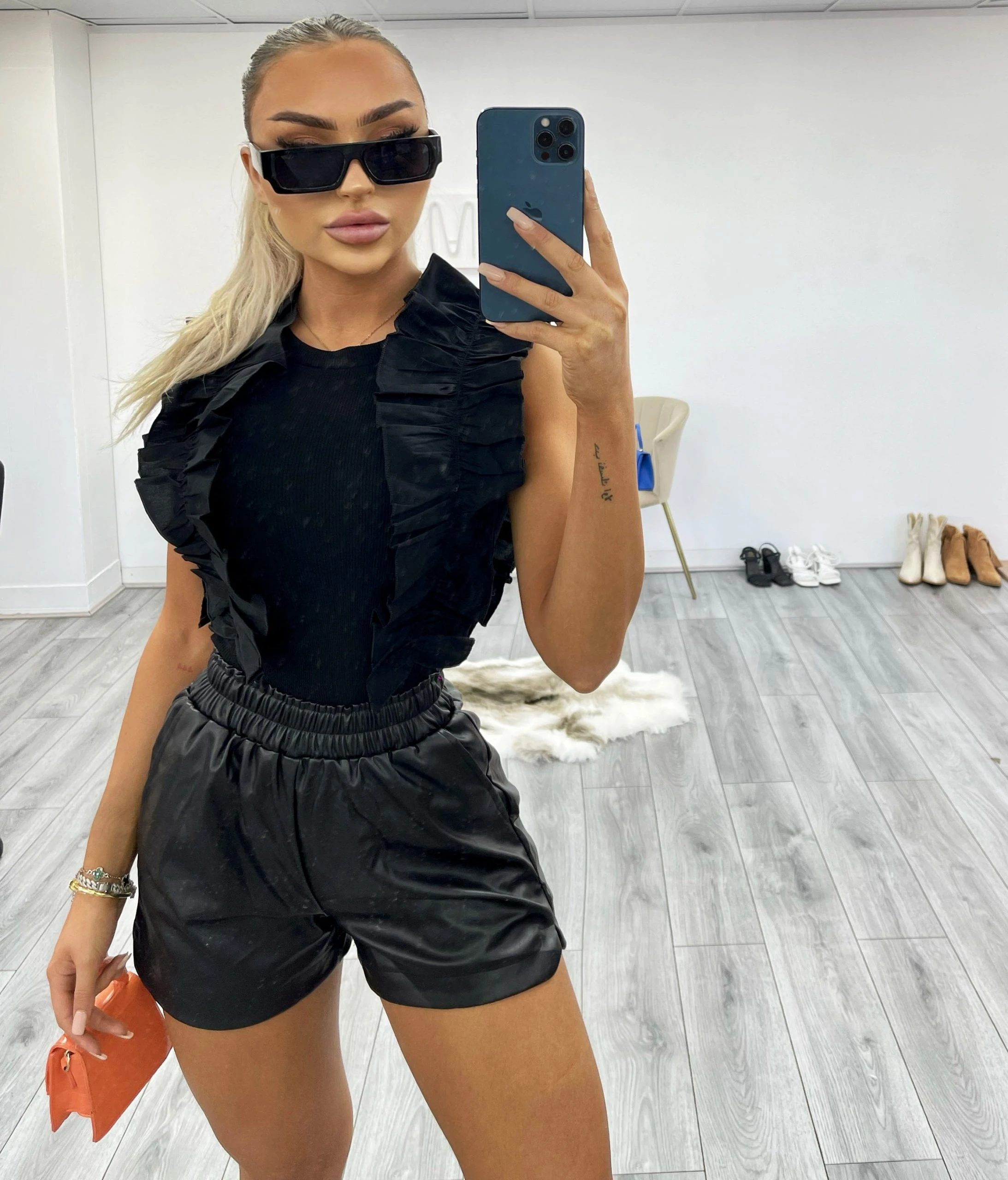 Miss Moda Luxe Black Frill Detailed Short Sleeve Bodysuit