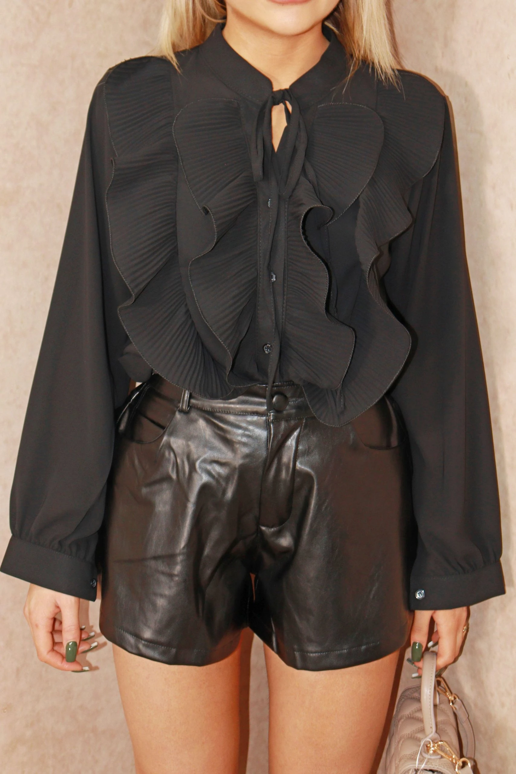Step up your winter wardrobe with this must have frill detailed button up blouse doll. Featuring a frill ruffle collar detailing, button up and a slim fit we cant get enough! Style with a pair of our Leather PU shorts and boots for a look we love.