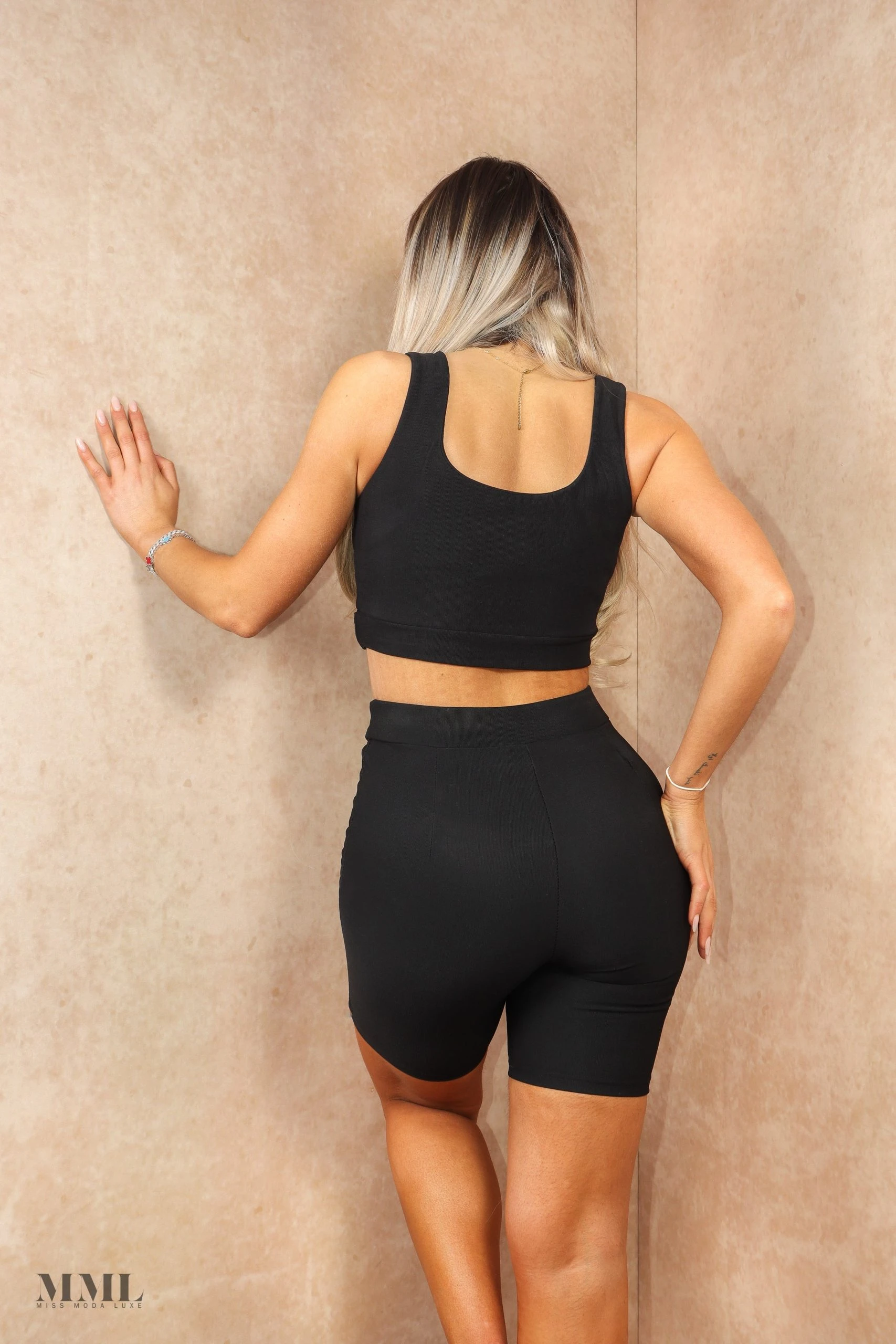 Get weekend ready with this must have black two-piece set with gold button detailing, lycra sculpting material, and co-ord crop style we can’t get enough! Style up with a pair of must have heels and blazer for a day to night look we love.Â