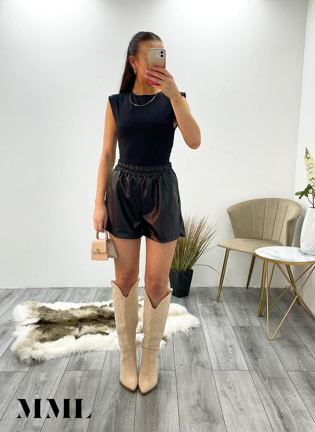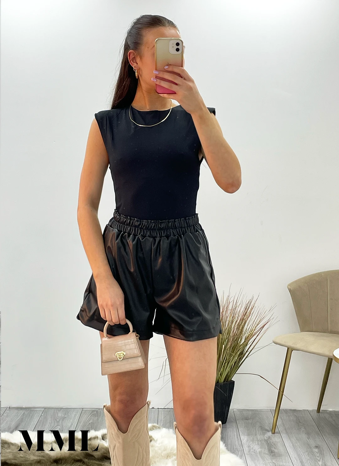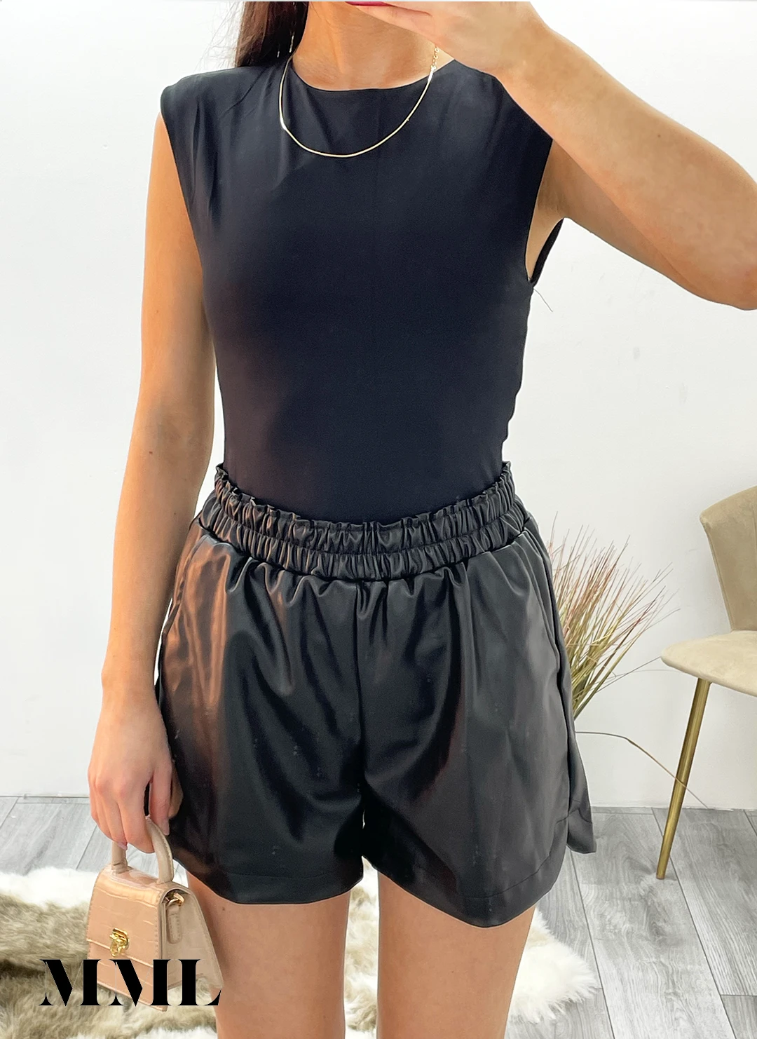 Miss Moda Luxe Black Slinky Shoulder Pad Sleeveless Bodysuit Top
