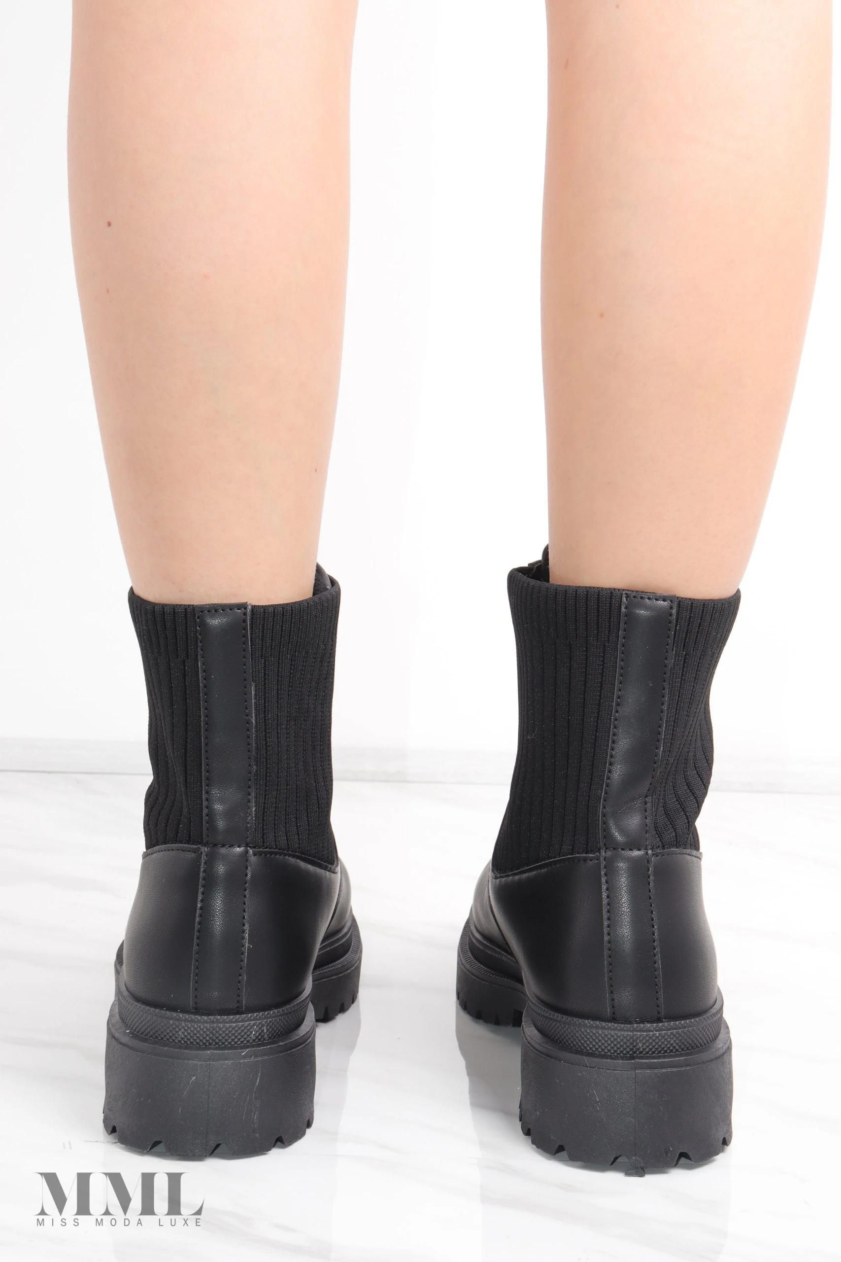 Miss Moda Luxe Black Zip Front Chunky Ribbed Ankle Boot