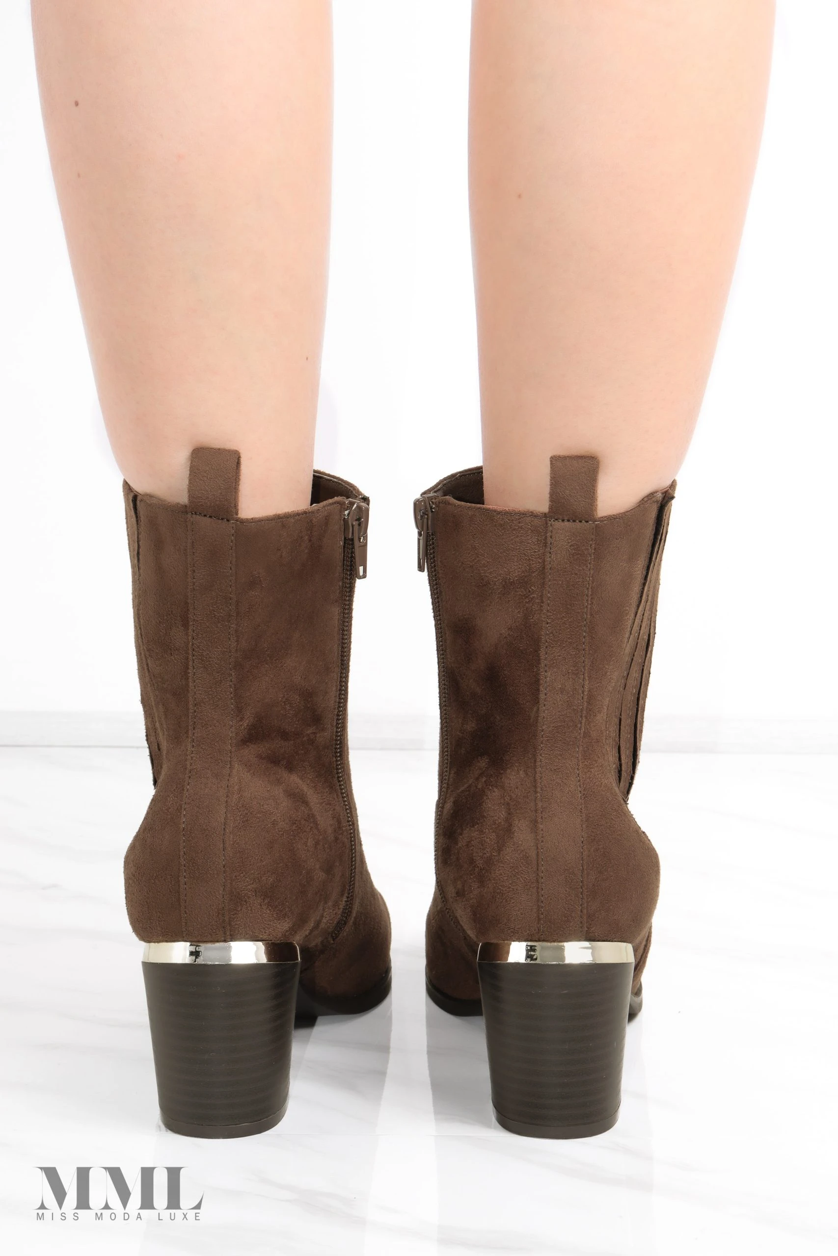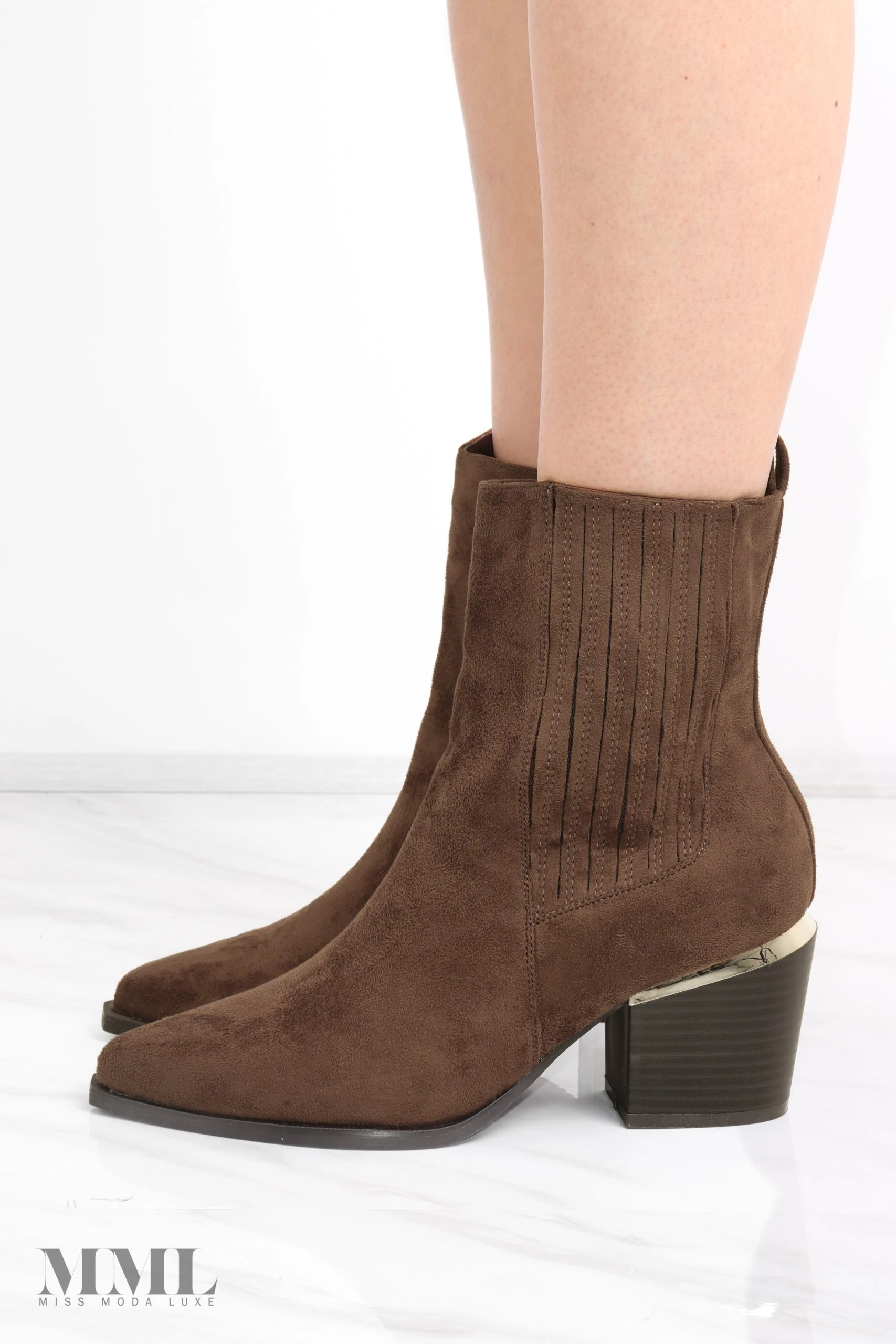 We are obsessed with this new heeled boot! Made from a super soft faux suede fabric. Fastened with an inner side zip and a back pull tab for quick and easy access. Block wooden heel with a metallic gold highlight. Completed with vertical stitching detail on the side.