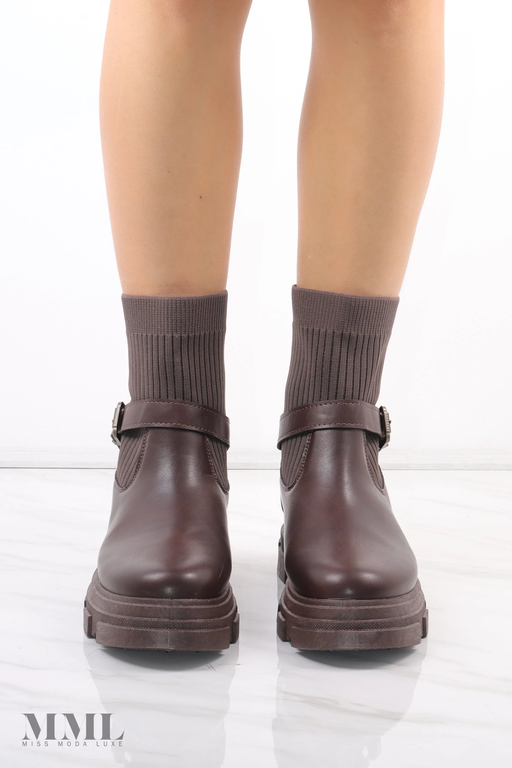 Autumn must have. Sock boot with faux leather base. Chunky soul with a buckle strap around the ankle. Slip on style.