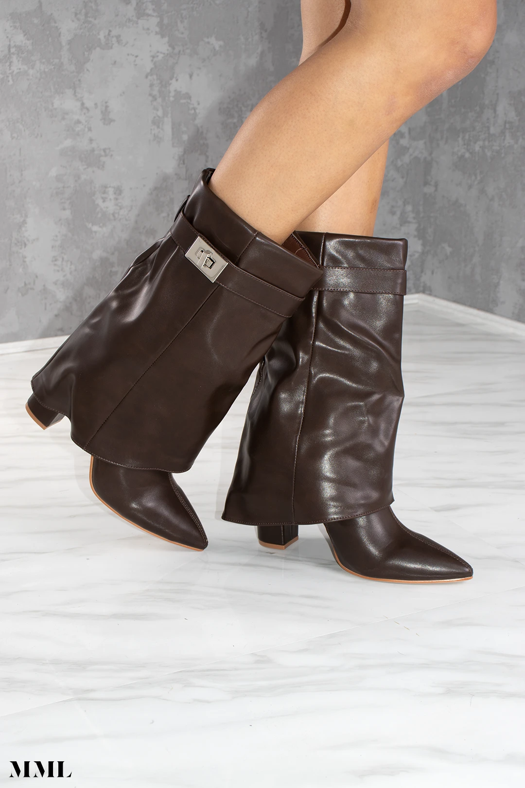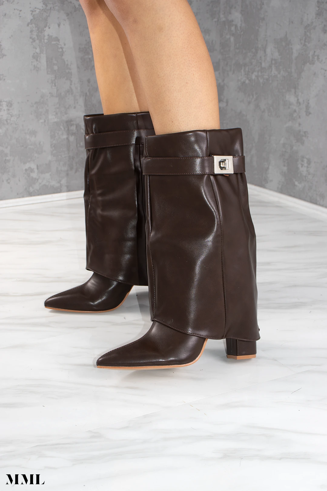 Miss Moda Luxe Brown Faux Leather Fold Over Buckle Shark Boot Mid