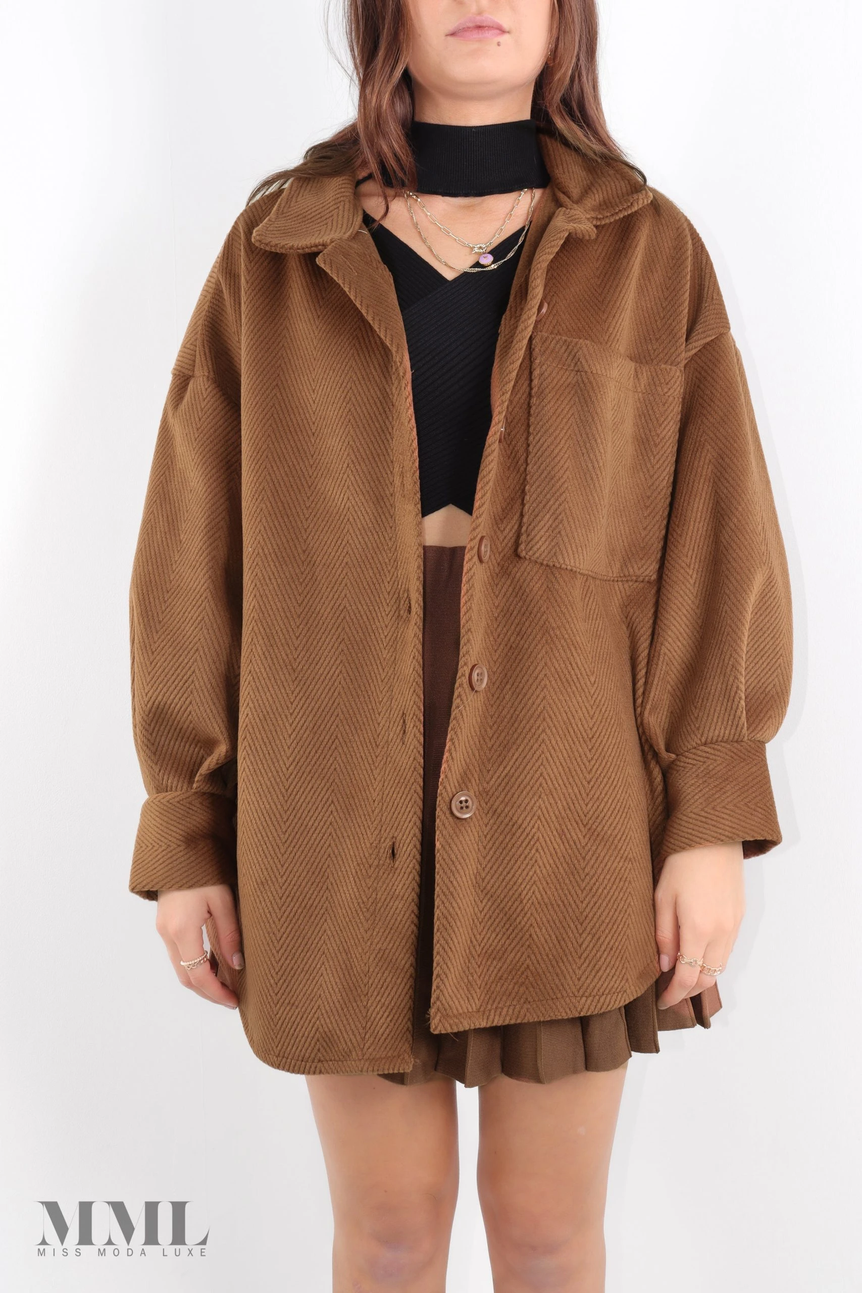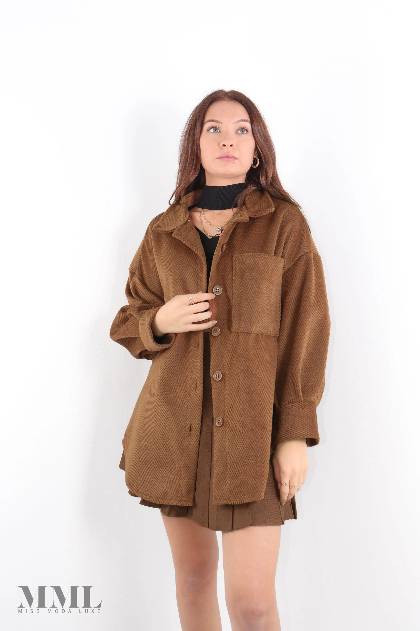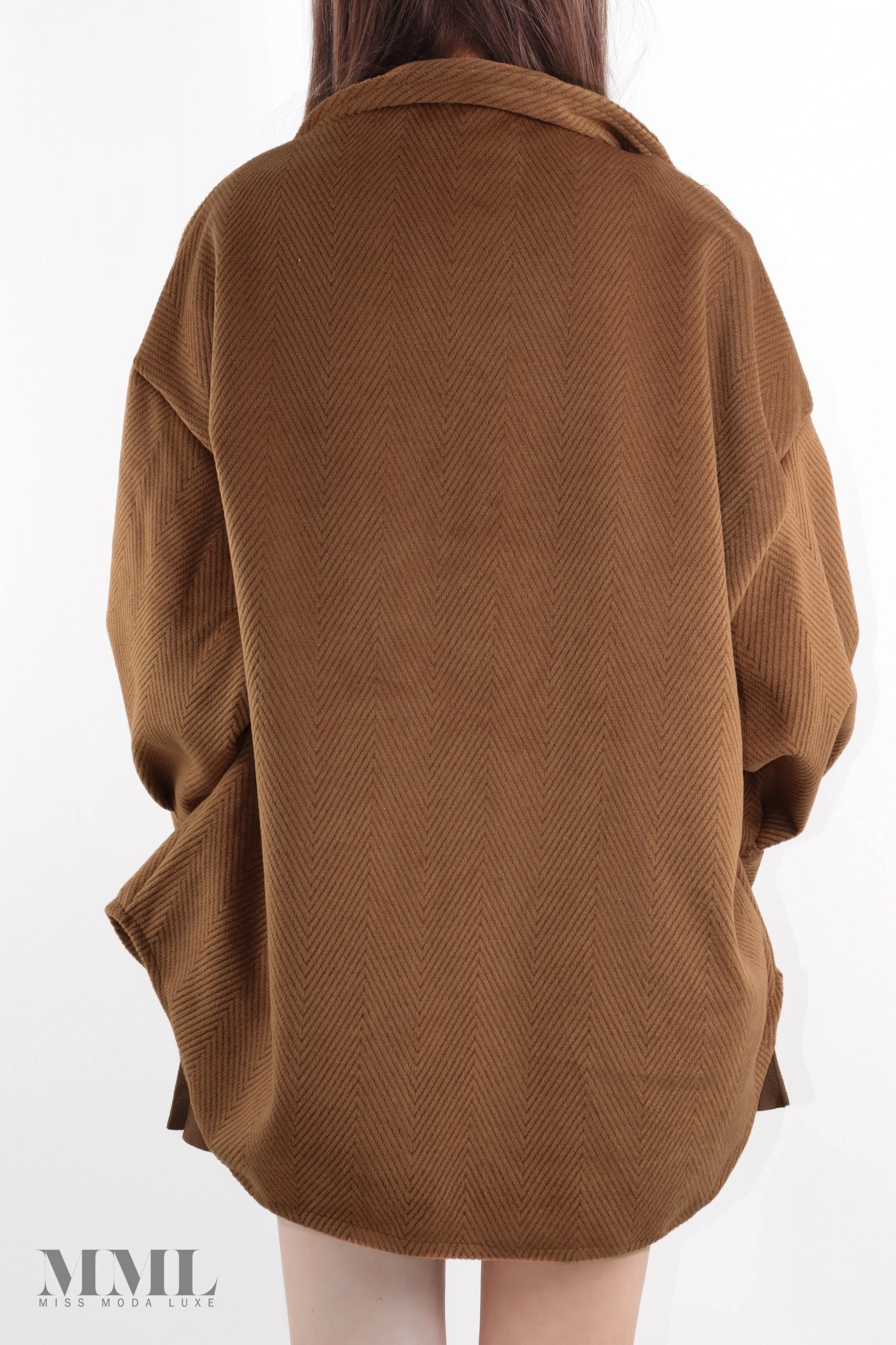 Miss Moda Luxe Brown Geometric Cord Button Down Shacket Pocket Detail