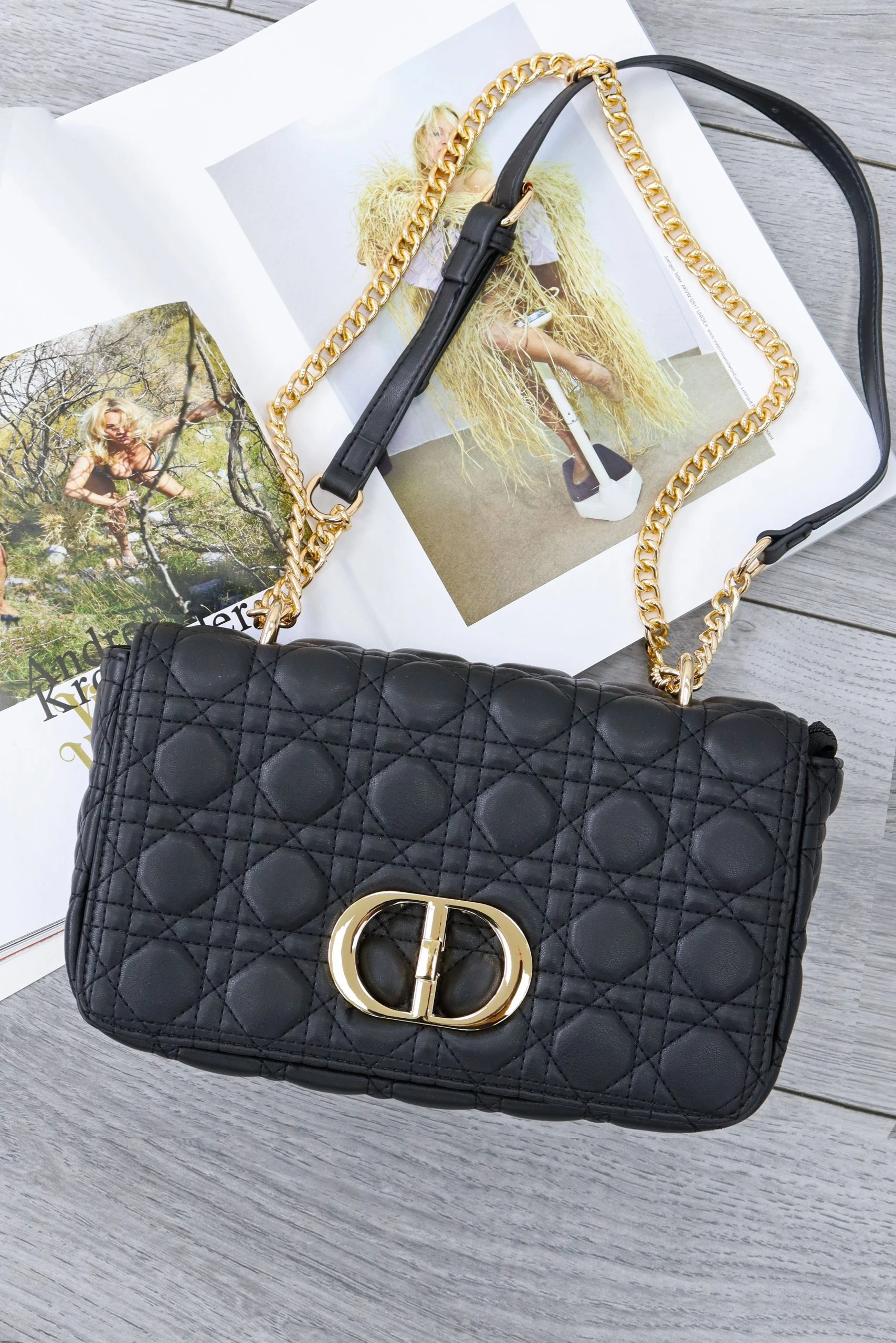 A classic handbag and perfect for all your post lockdown plans. Featuring a black faux leather material with stitched pattern detailing, gold hardware, and a flap over design with a twist clasp fastening. With an adjustable chain detail strap, this bag can be worn across the body, or on the shoulder. Available in multiple colours.