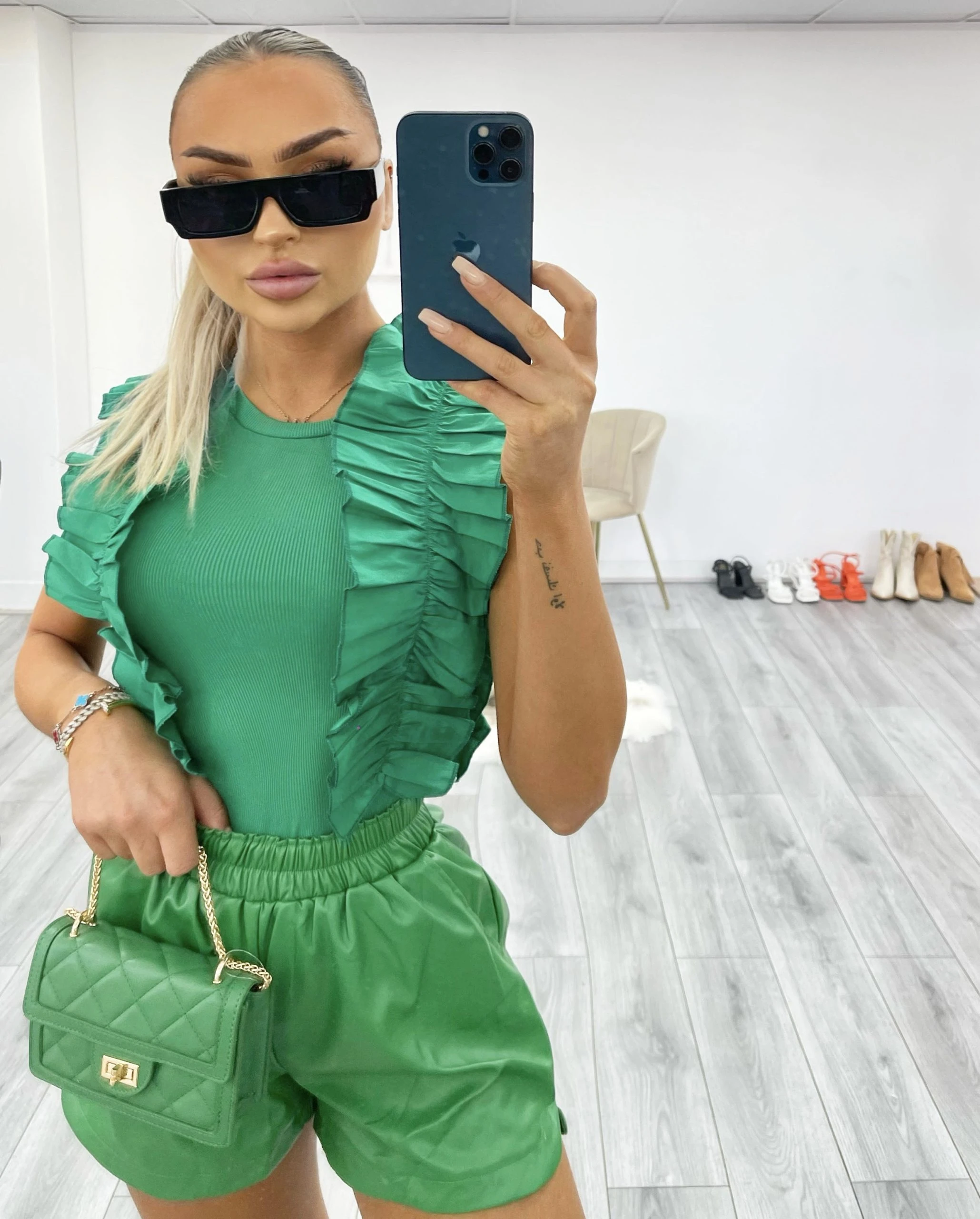 Get your holiday wardrobe ready with this must have frill detailed bodysuit doll. Featuring a luxury cotton material, frill lining and short sleeve sculpting fit we are obsessed. Style with our must have leather shorts for a look we can’t get enough of.Â
