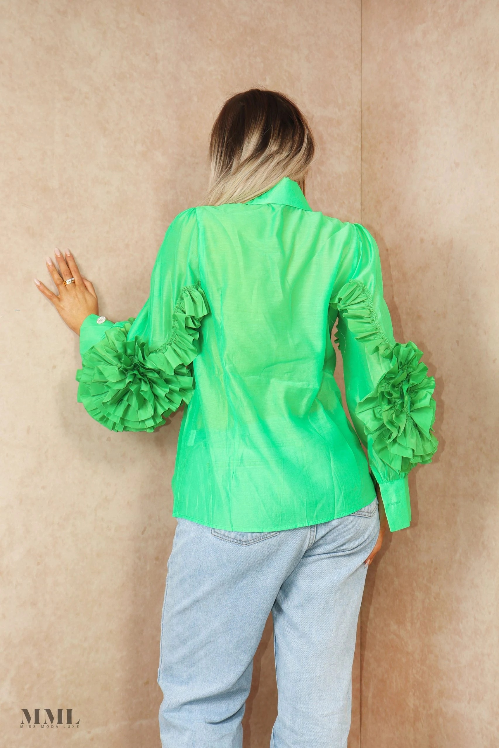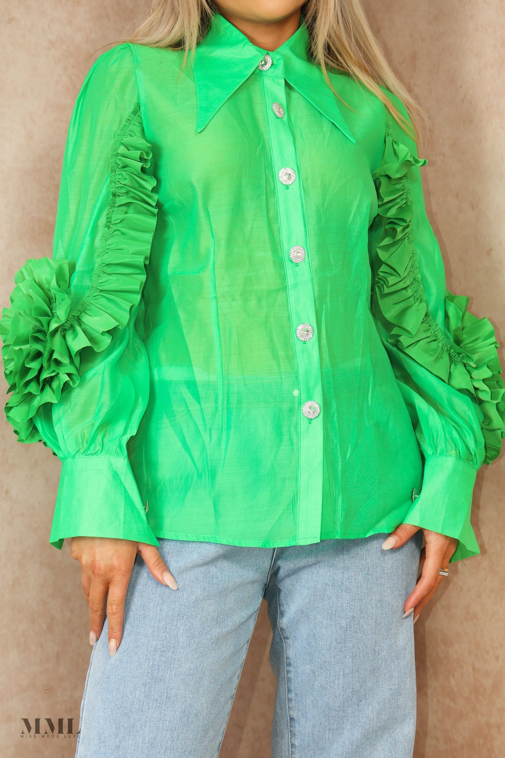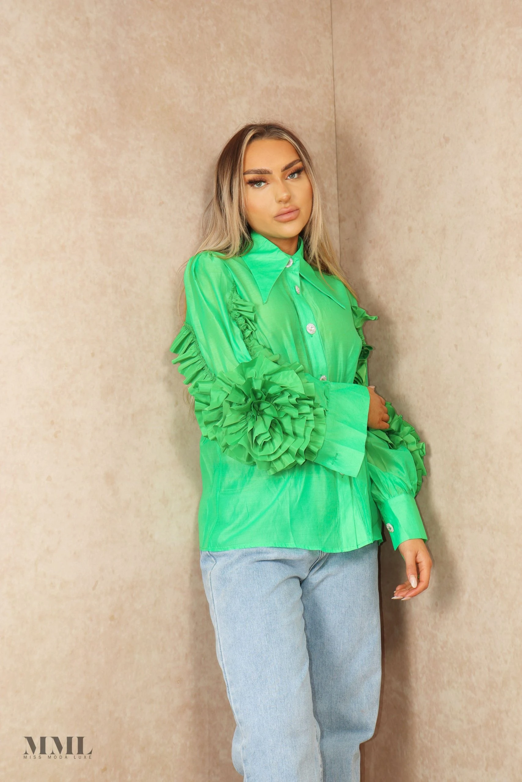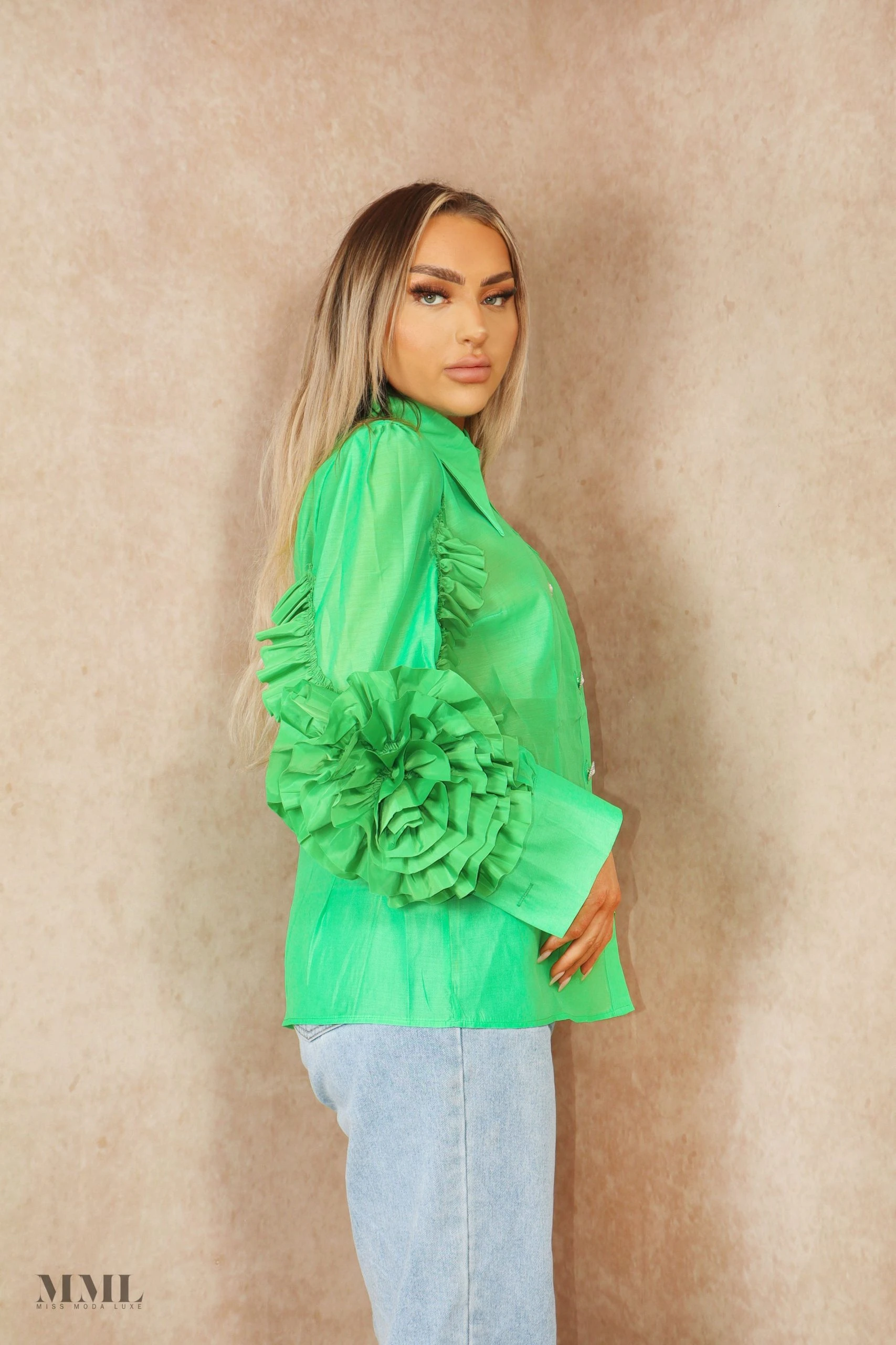 Level up your night out wardrobe with this must have ruffle puff frilled blouse doll! Featuring organza material, frill puff shoulder detailing and diamante buttons we are obsessed. Style with a pair of denim jeans and matching heels for a look we cant get enough of this season.