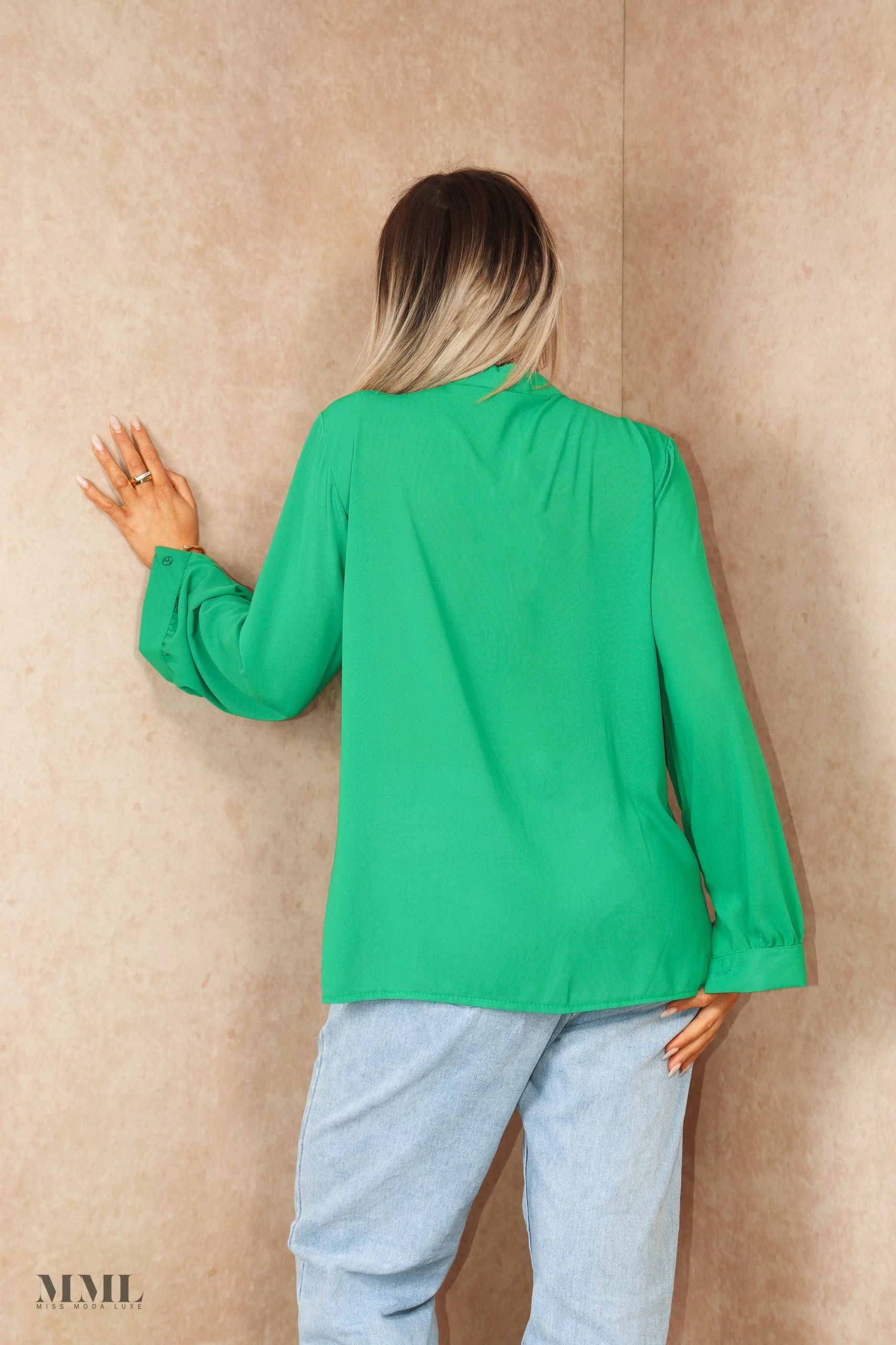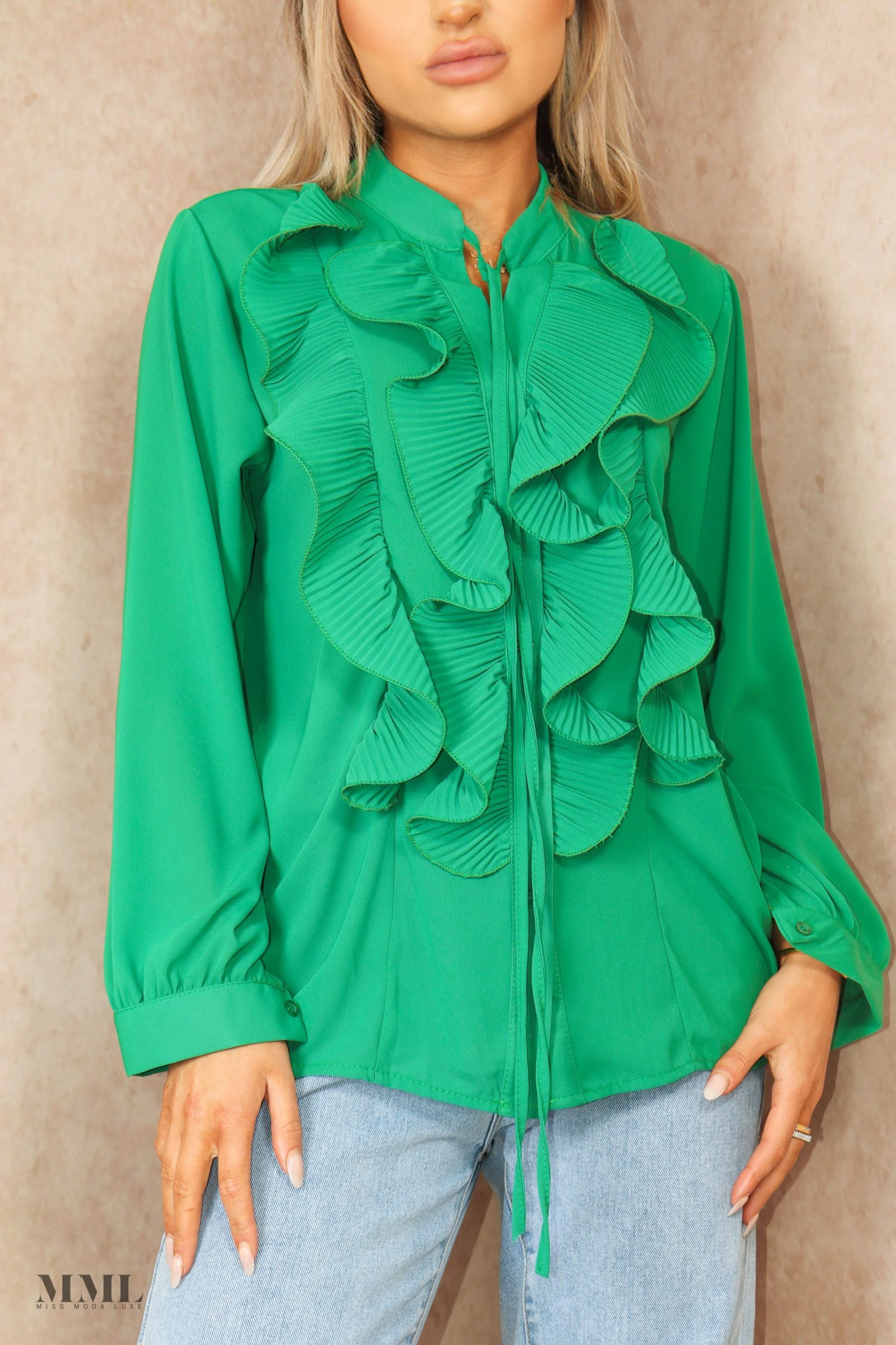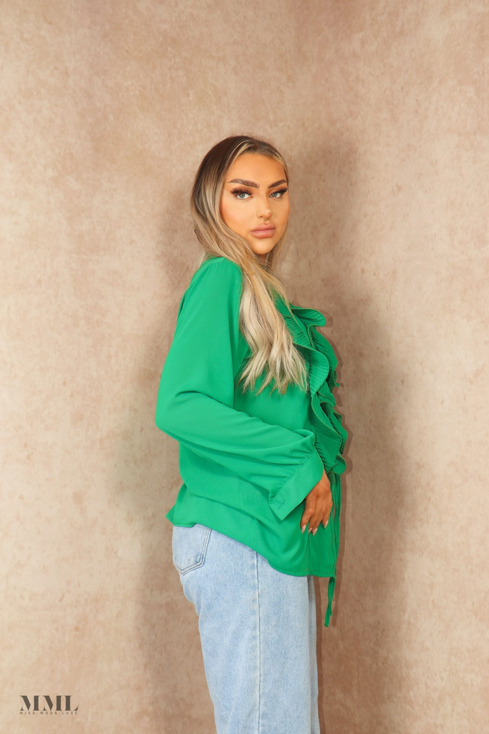 Miss Moda Luxe Green Ruffle Chest Button Up Blouse