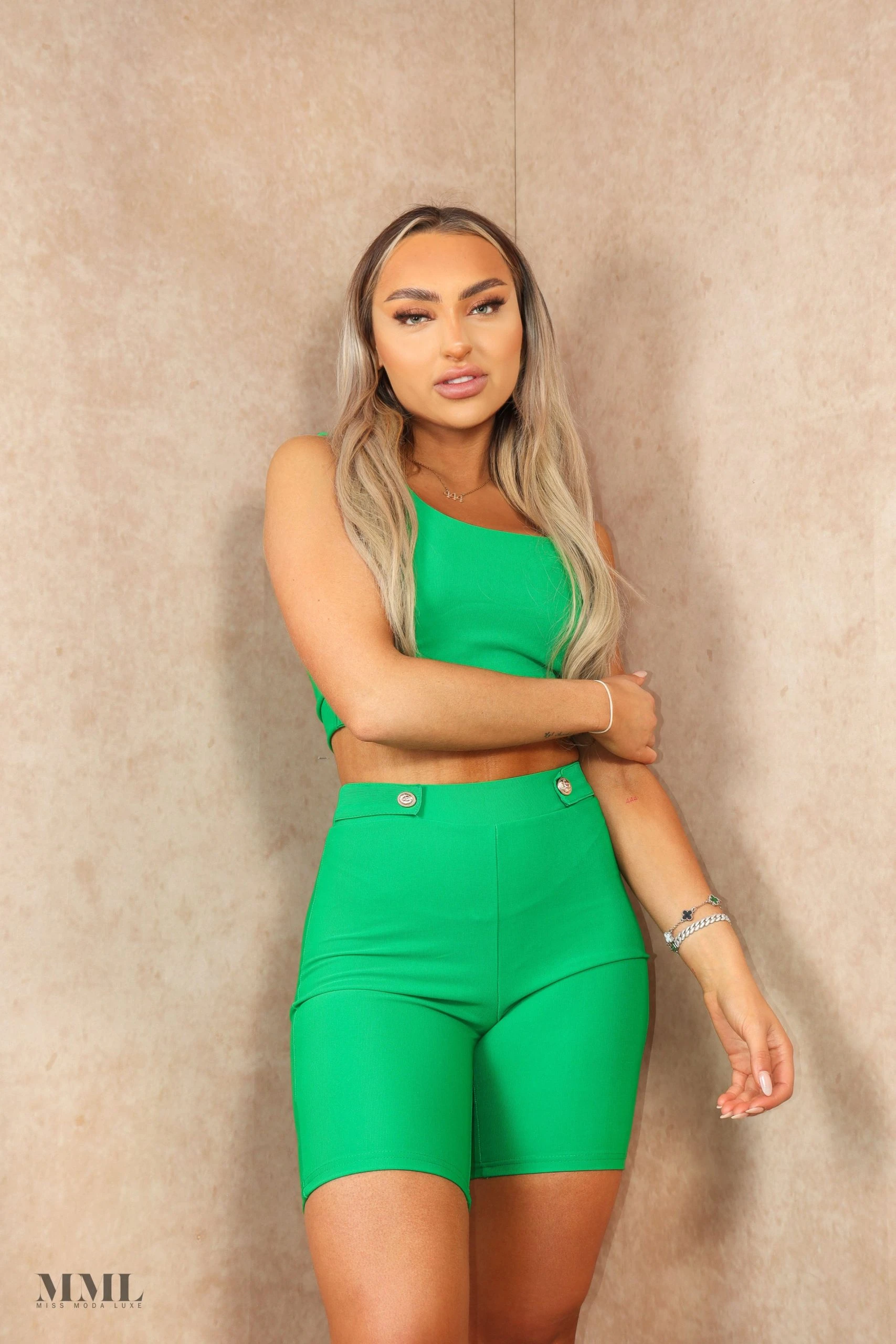 Miss Moda Luxe Green Sculpting Crop Top Gold Button Detailed Short Set