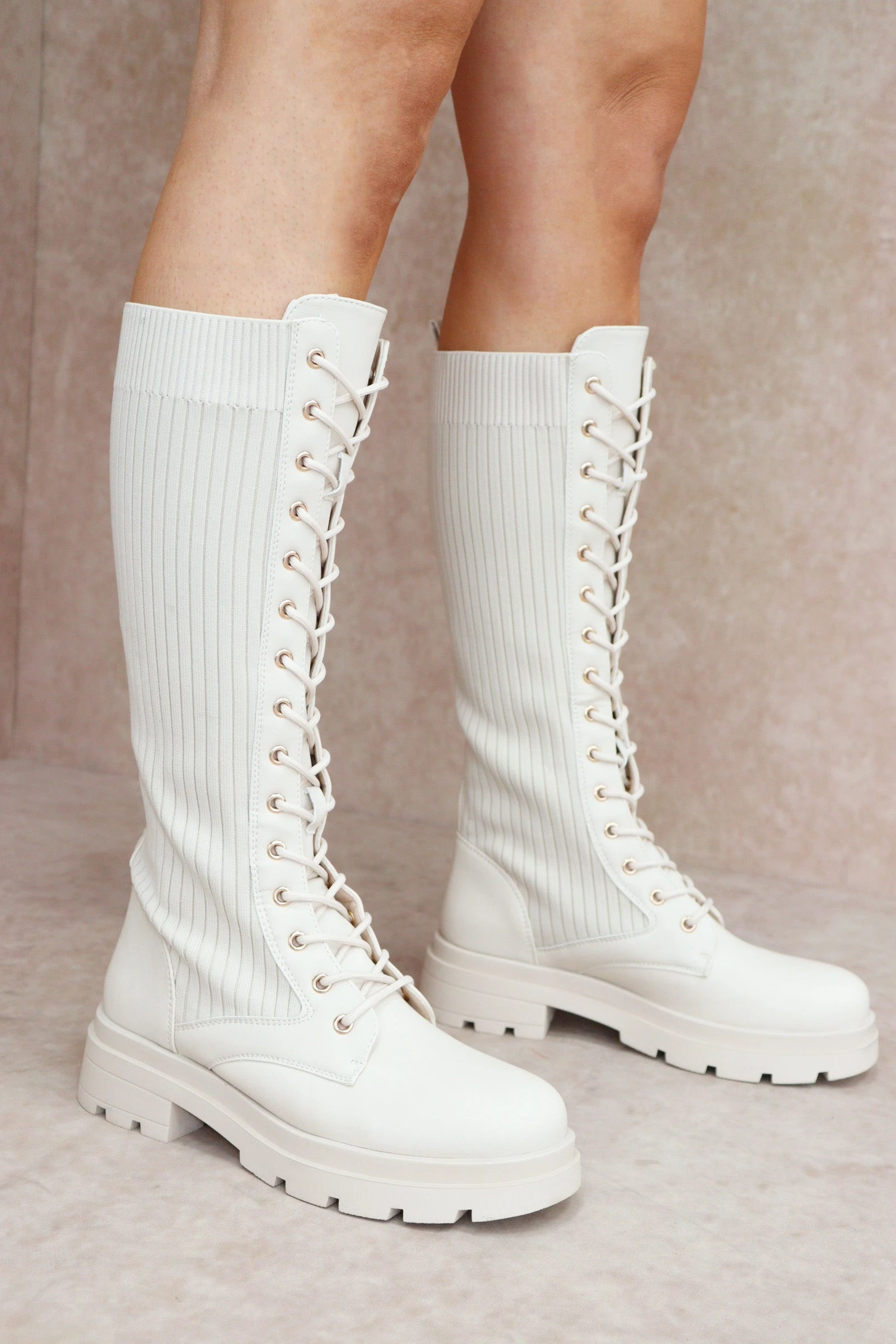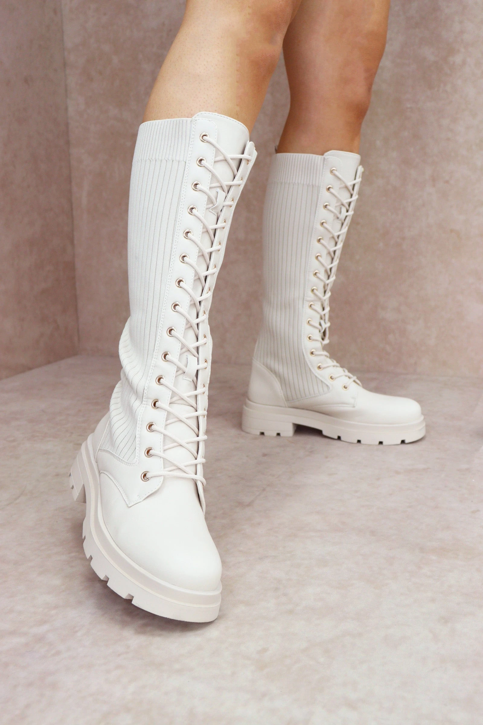 Stand Out in these on trend over the knee HOLLY ribbed chunky sole leather look boots. Featuring thick ribbed detailing, knee high laces and a chunky faux leather sole. We are obsessed.