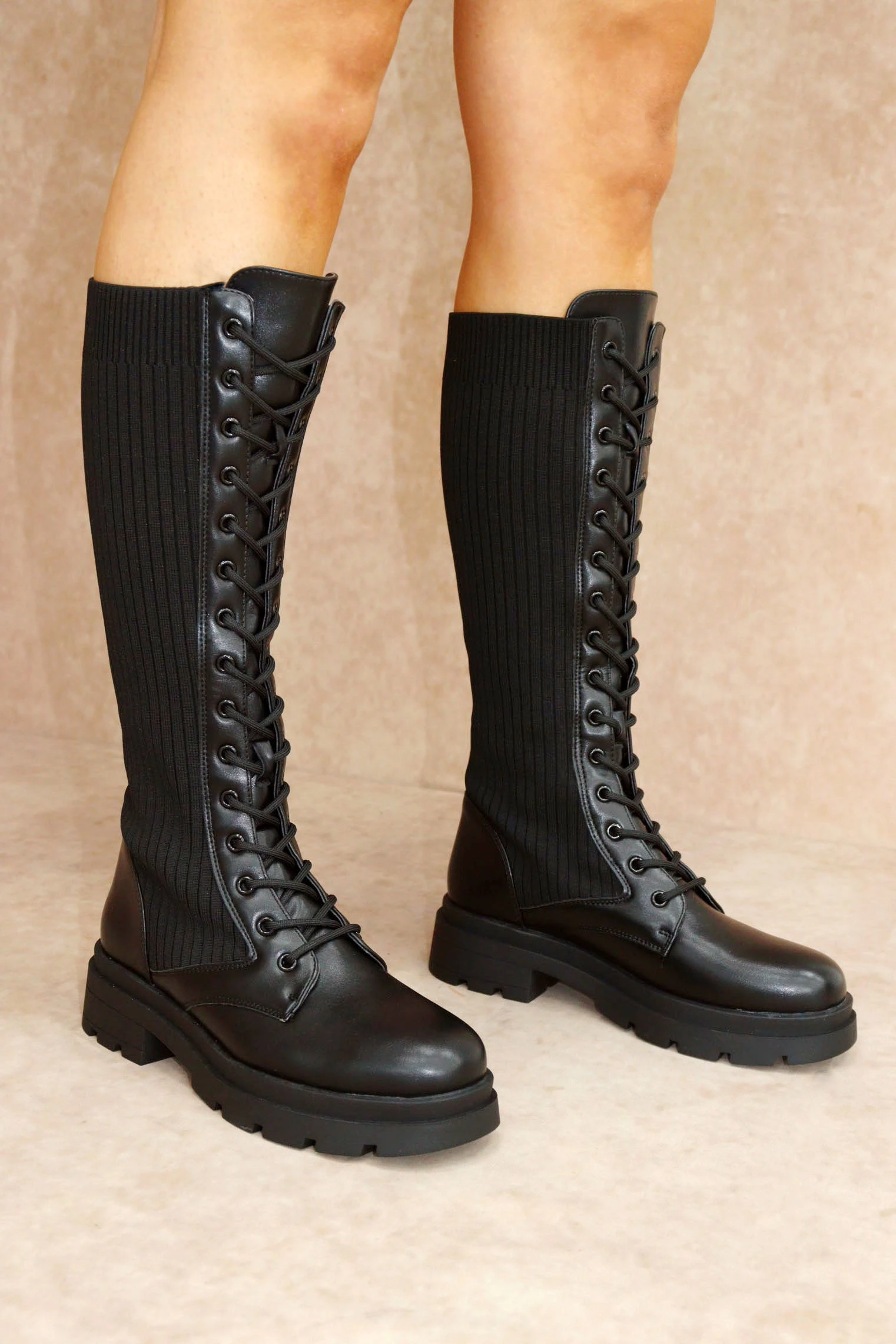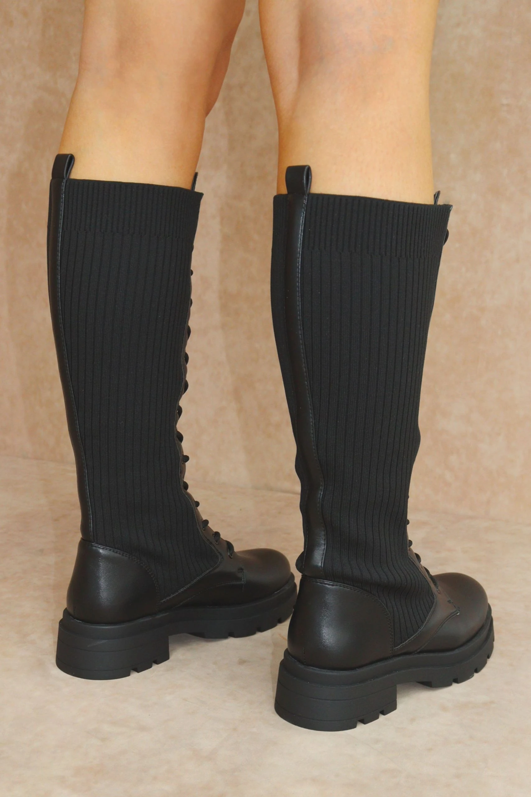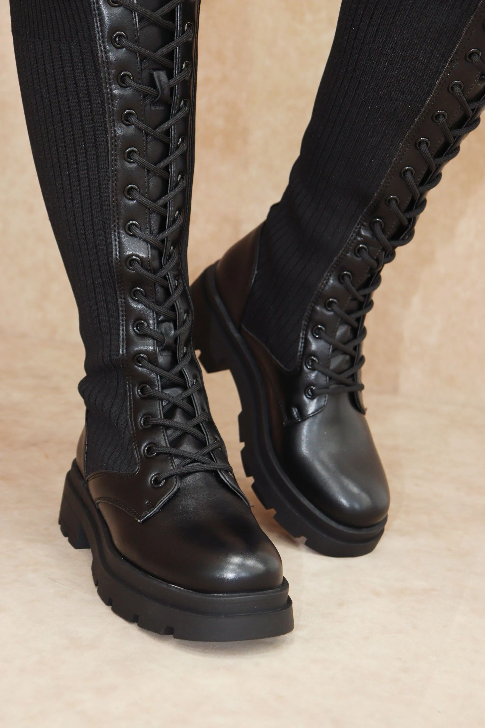 Stand Out in these on trend over the knee HOLLY ribbed chunky sole leather look boots. Featuring thick ribbed detailing, knee high laces and a chunky faux leather sole. We are obsessed.