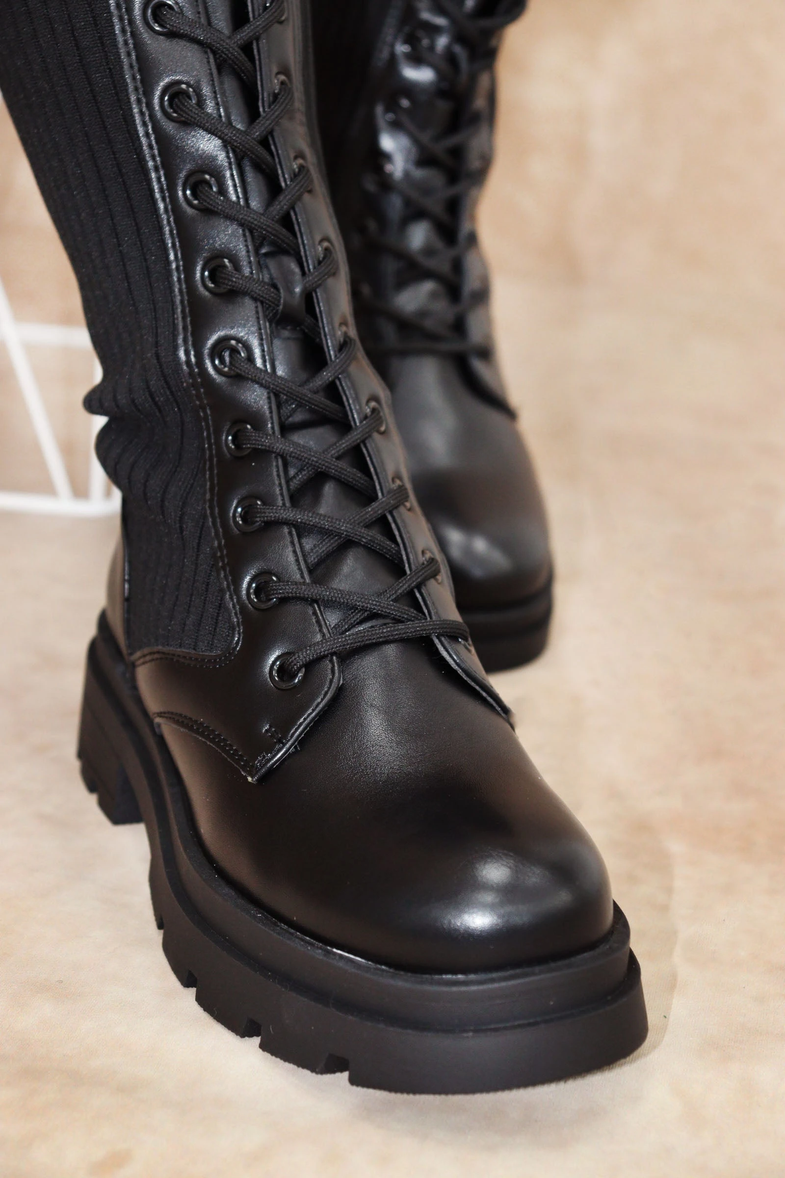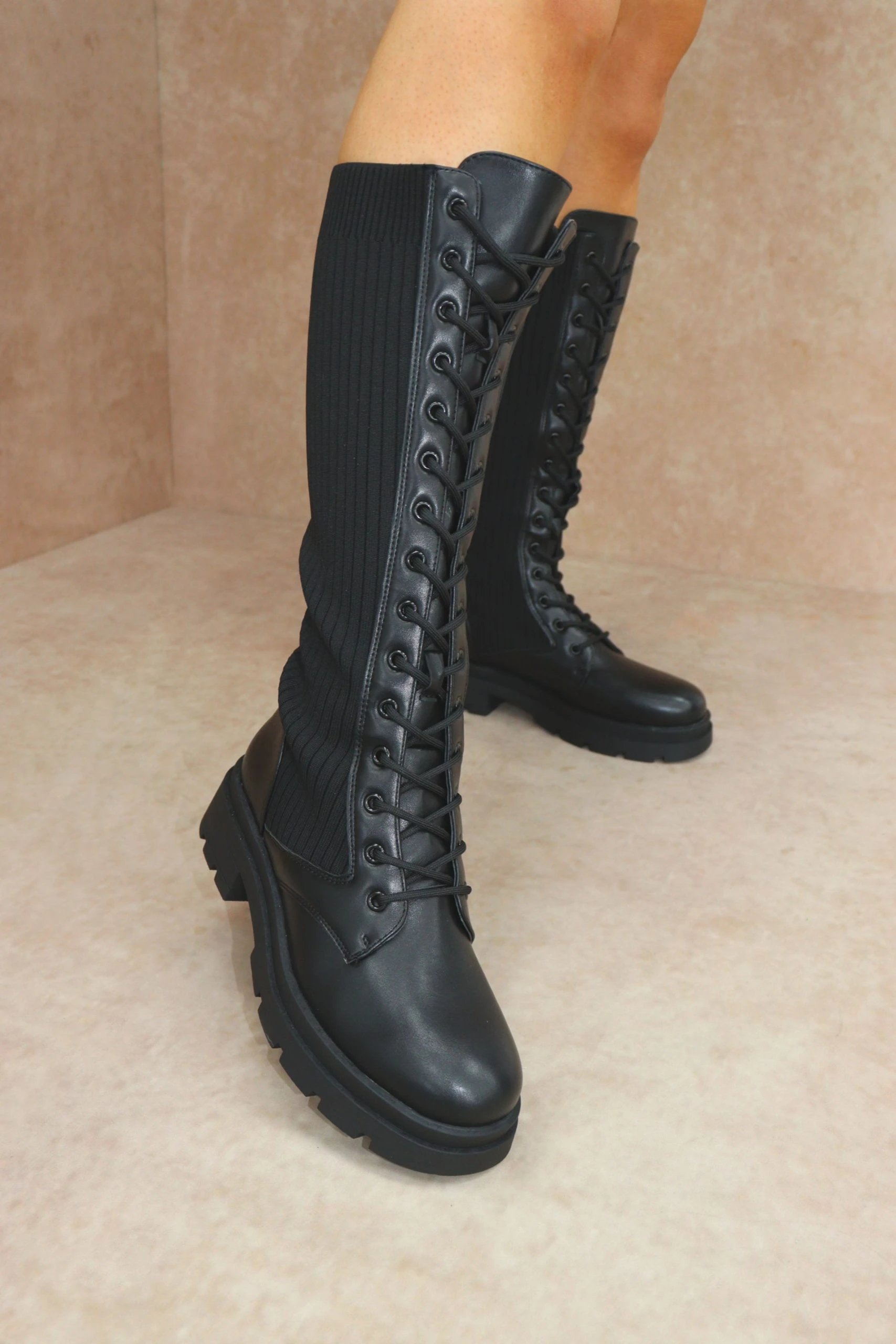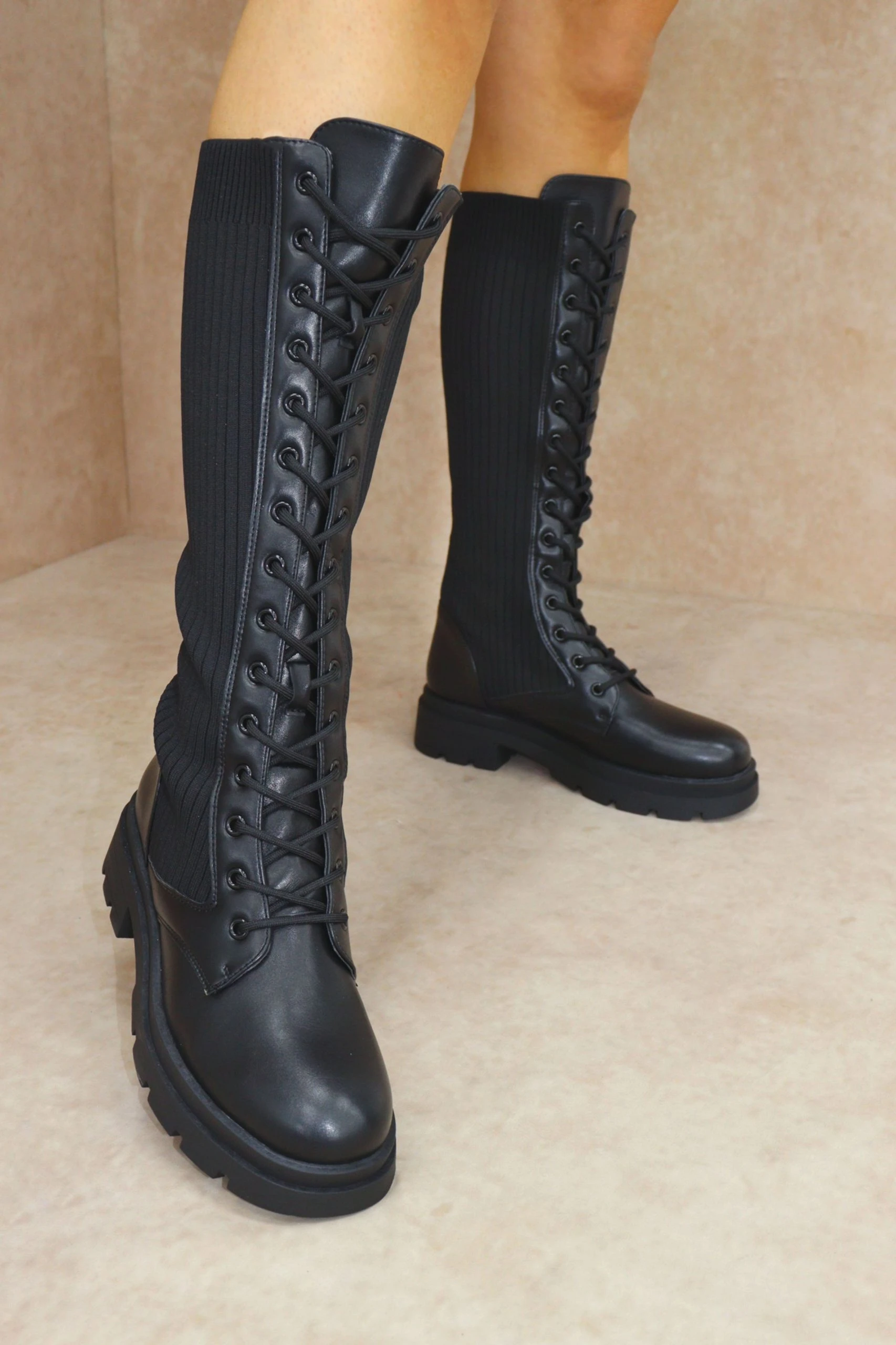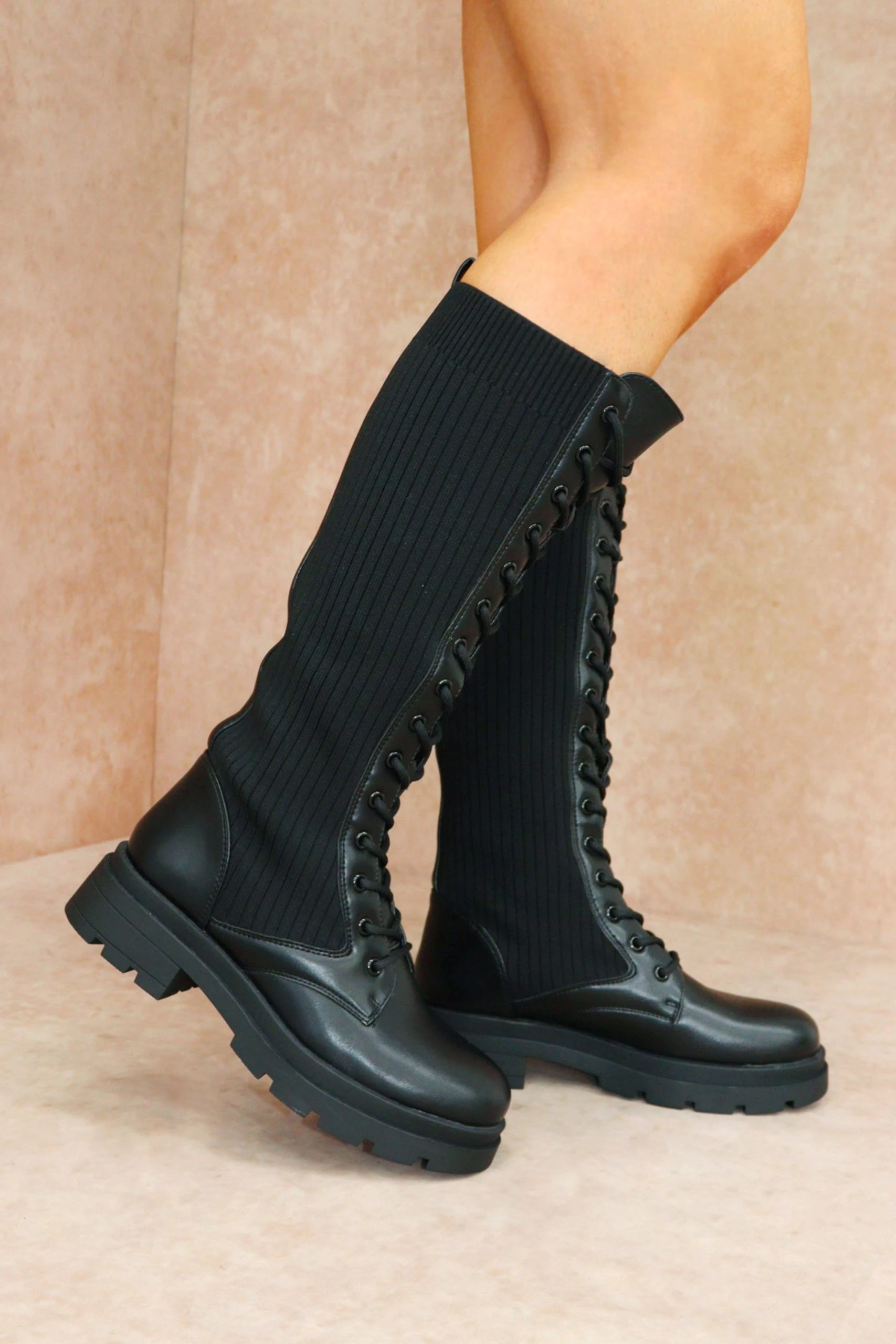 Stand Out in these on trend over the knee HOLLY ribbed chunky sole leather look boots. Featuring thick ribbed detailing, knee high laces and a chunky faux leather sole. We are obsessed.