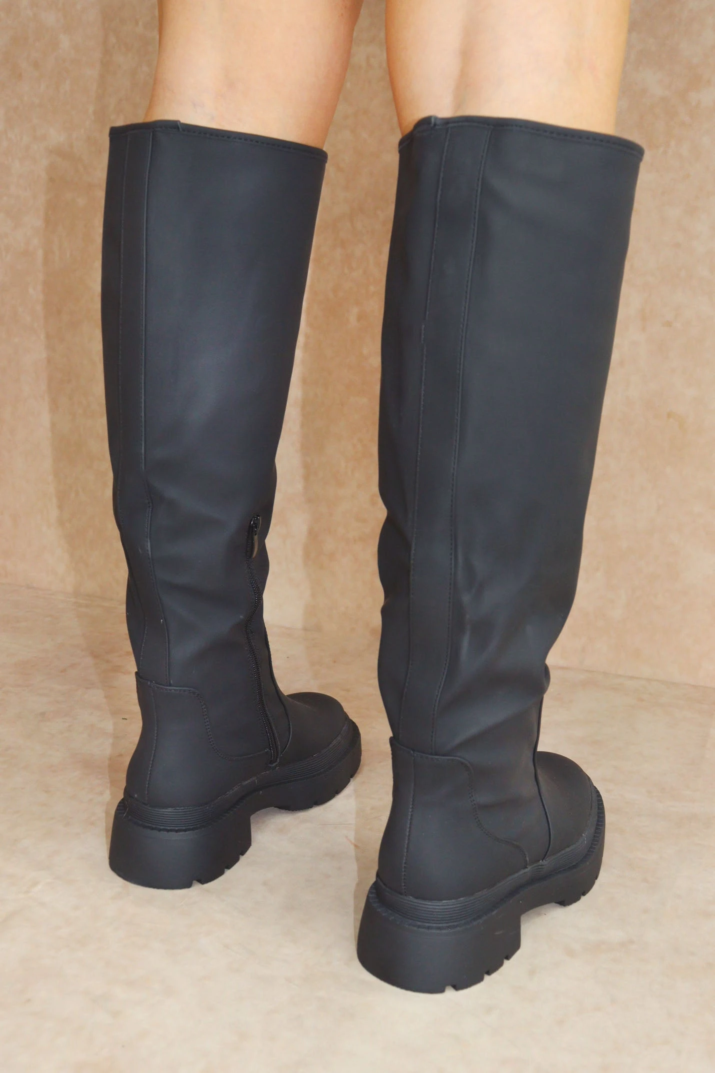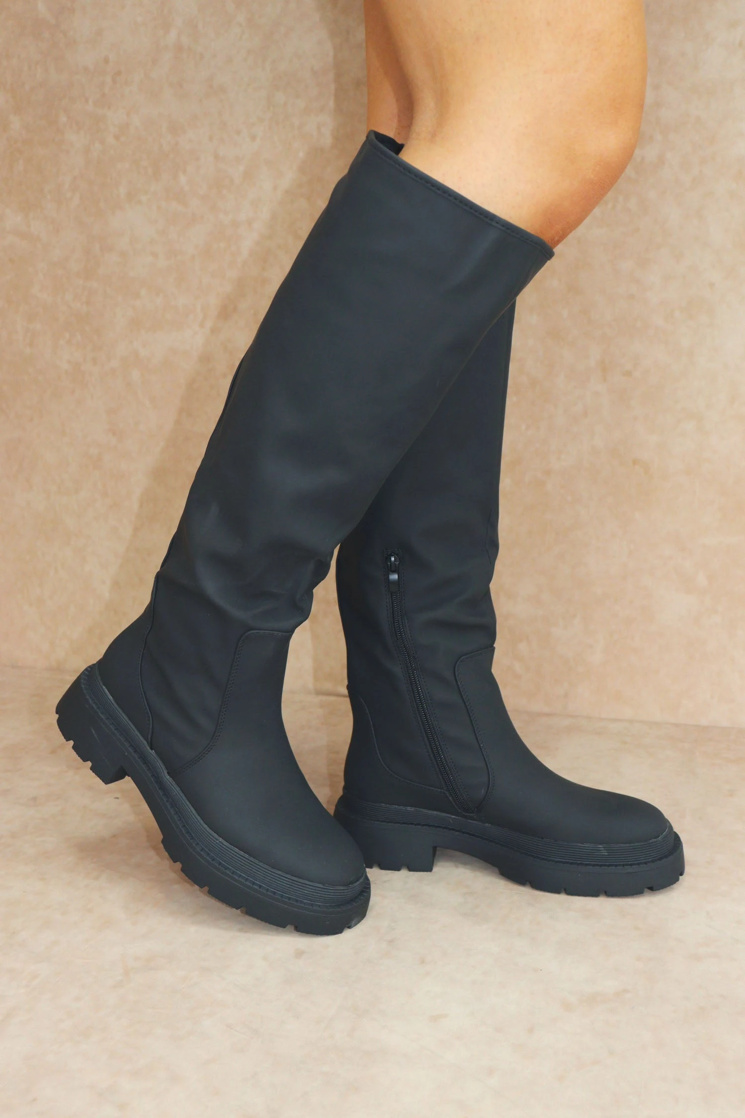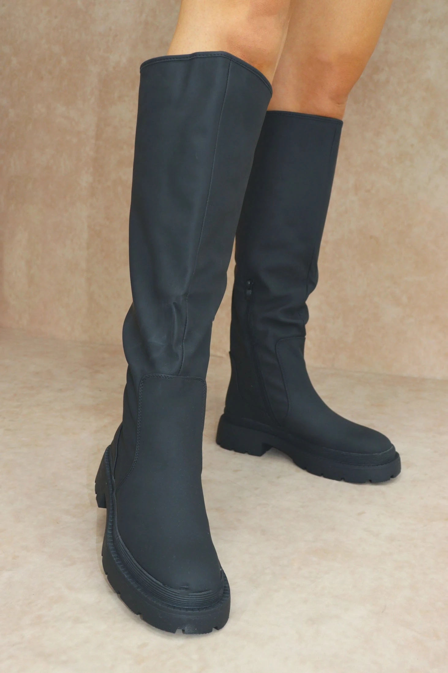 Stay on trend in these wellie boots, perfect for the winter weather. Featuring rubberised material, side zip fastenings, thick cleated soles and wellie boot design.