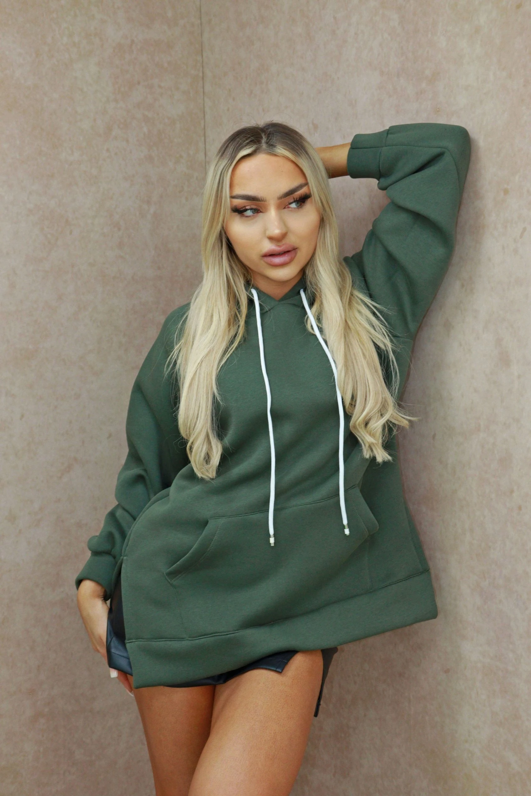 Miss Moda Luxe Khaki Green Oversized Basic Cotton Hoodie