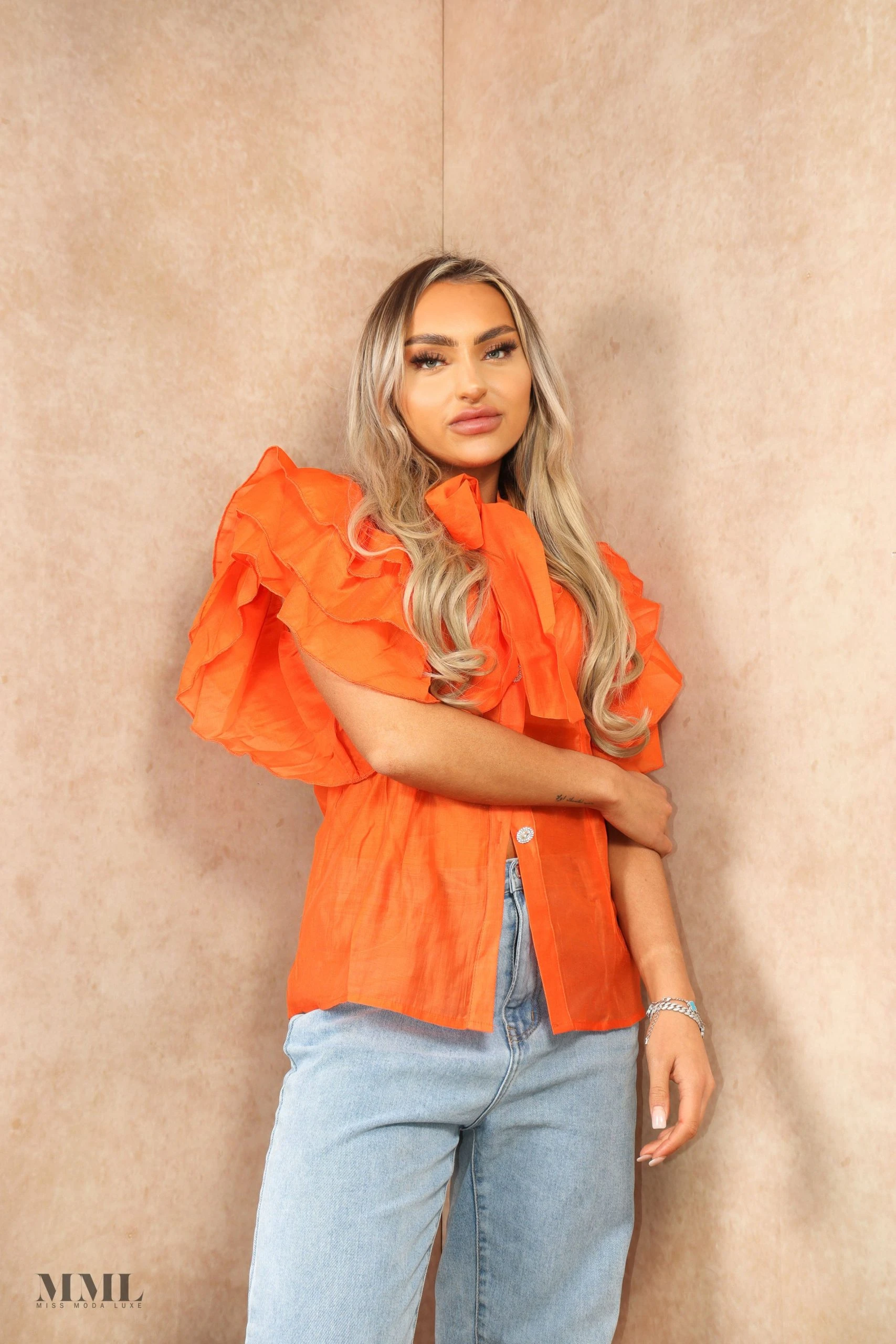 Level up your night out wardrobe with this must have ruffle puff frilled blouse doll! Featuring organza cotton material, frill puff shoulder detailing and diamante buttons we are obsessed. Style with a pair of denim jeans and matching heels for a look we cant get enough of this season.
