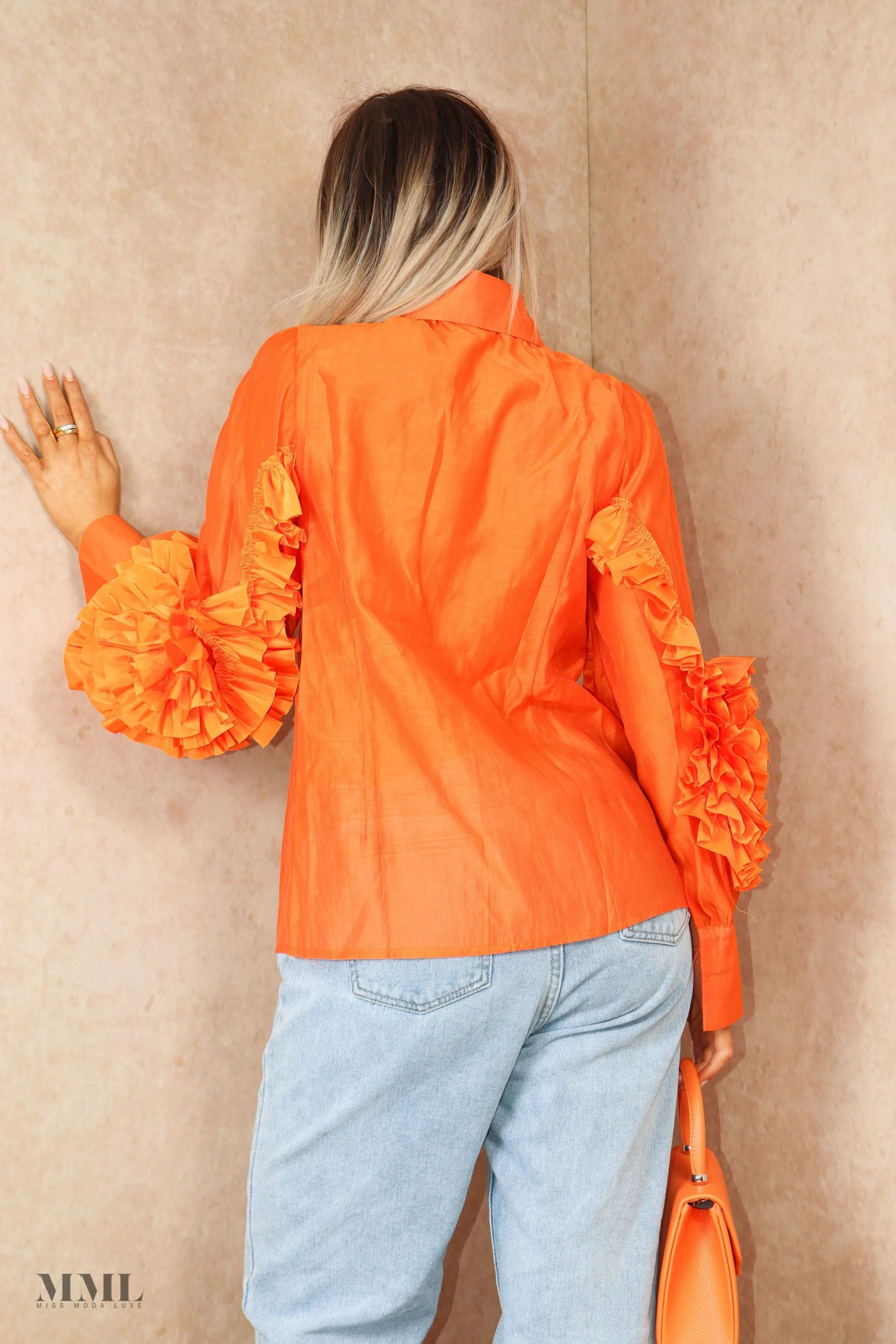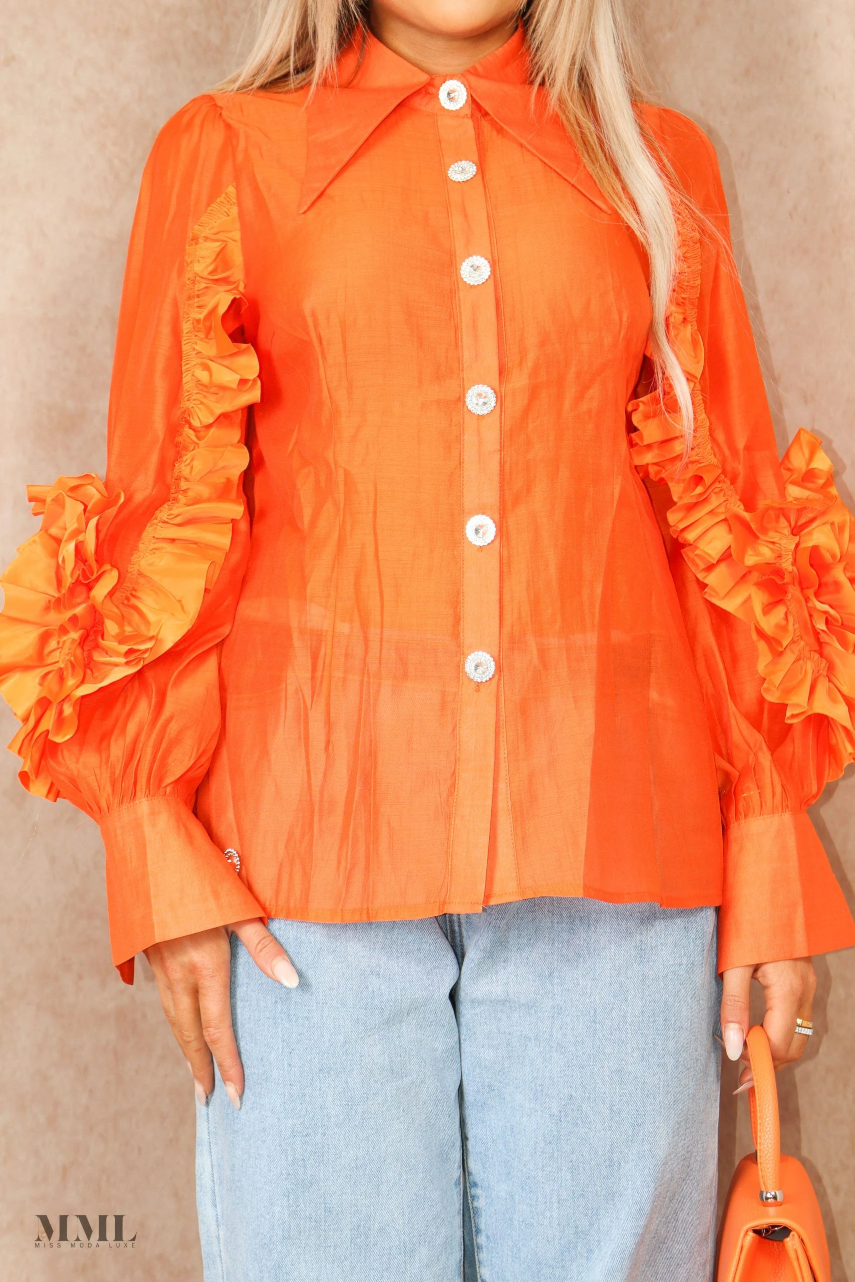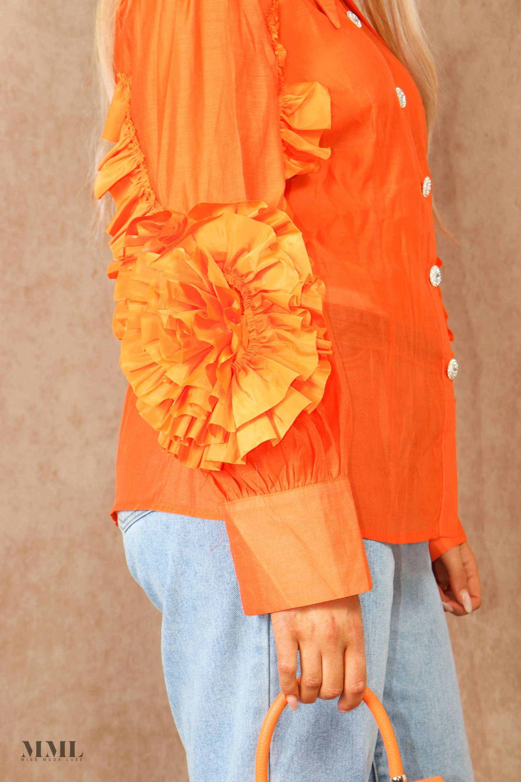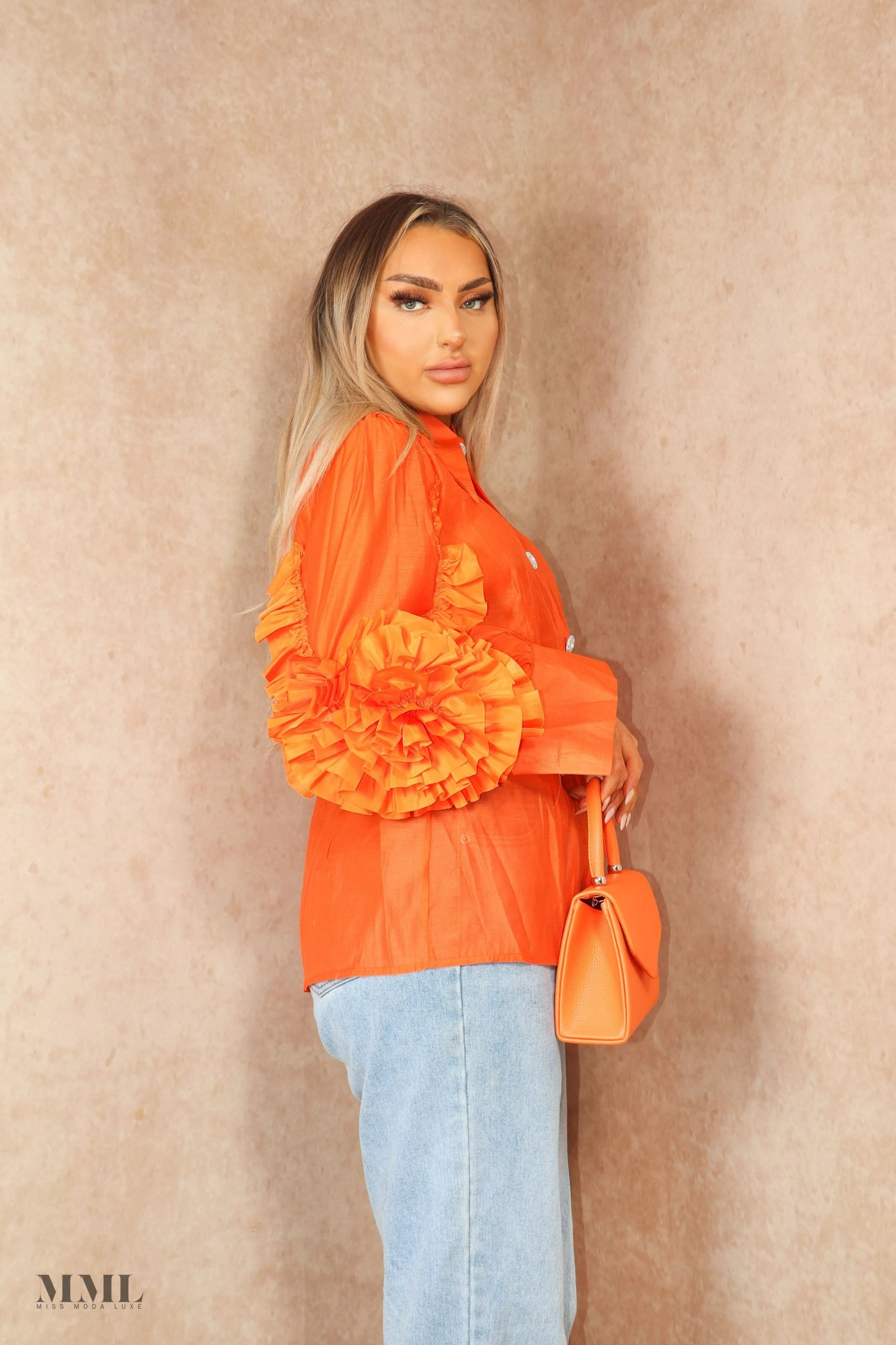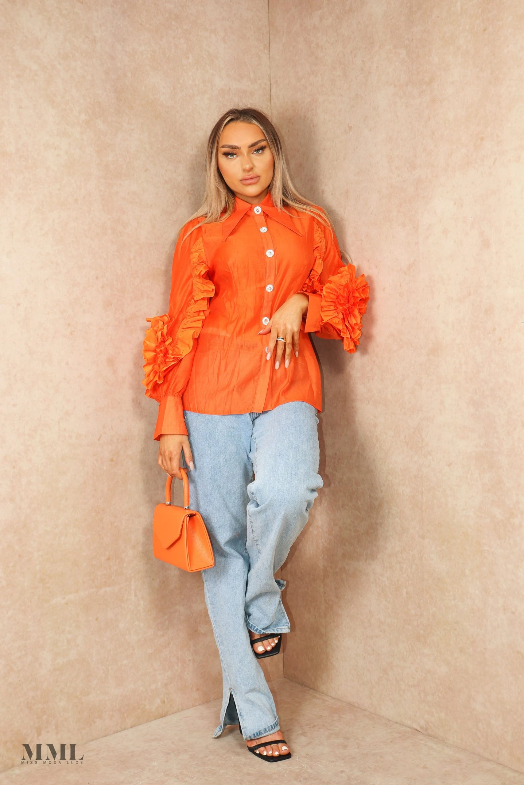 Level up your night out wardrobe with this must have ruffle puff frilled blouse doll! Featuring organza material, frill puff shoulder detailing and diamante buttons we are obsessed. Style with a pair of denim jeans and matching heels for a look we cant get enough of this season.