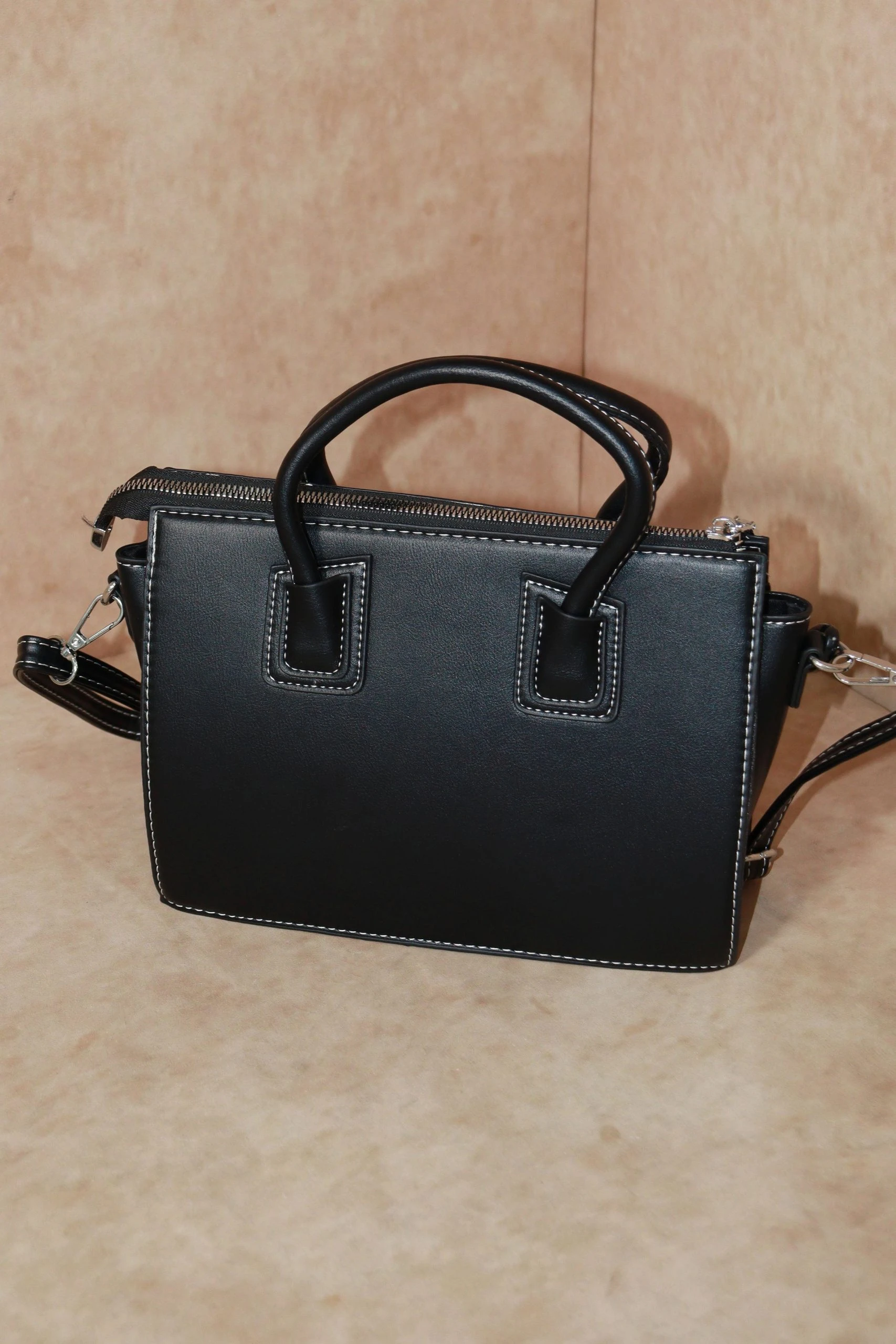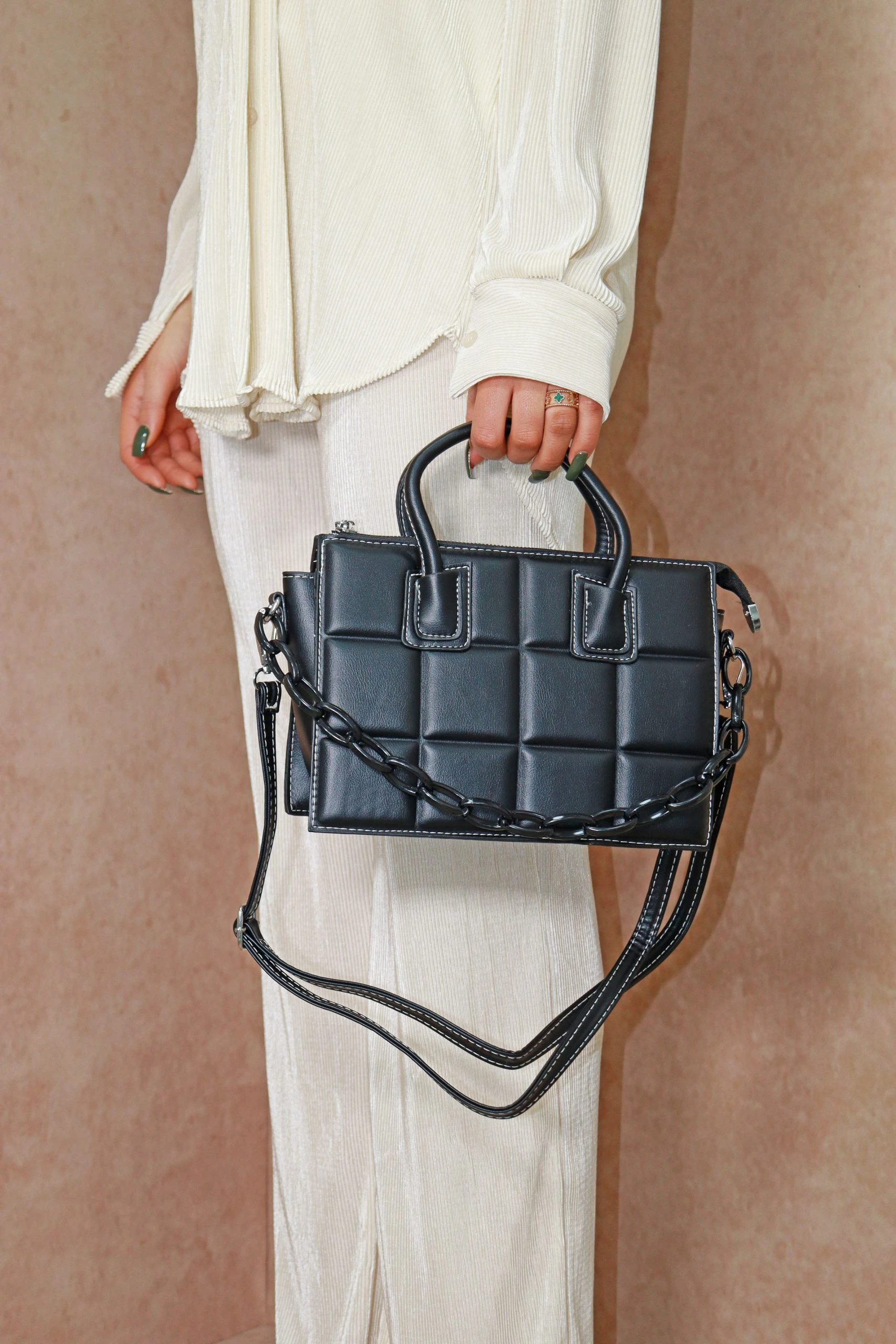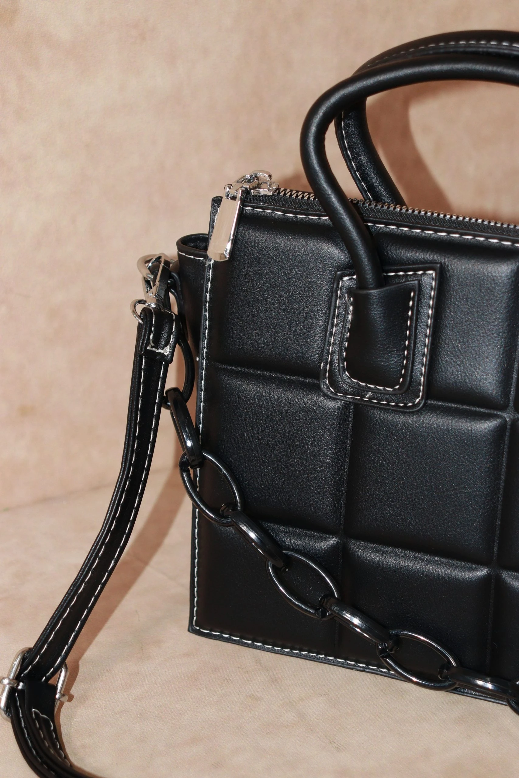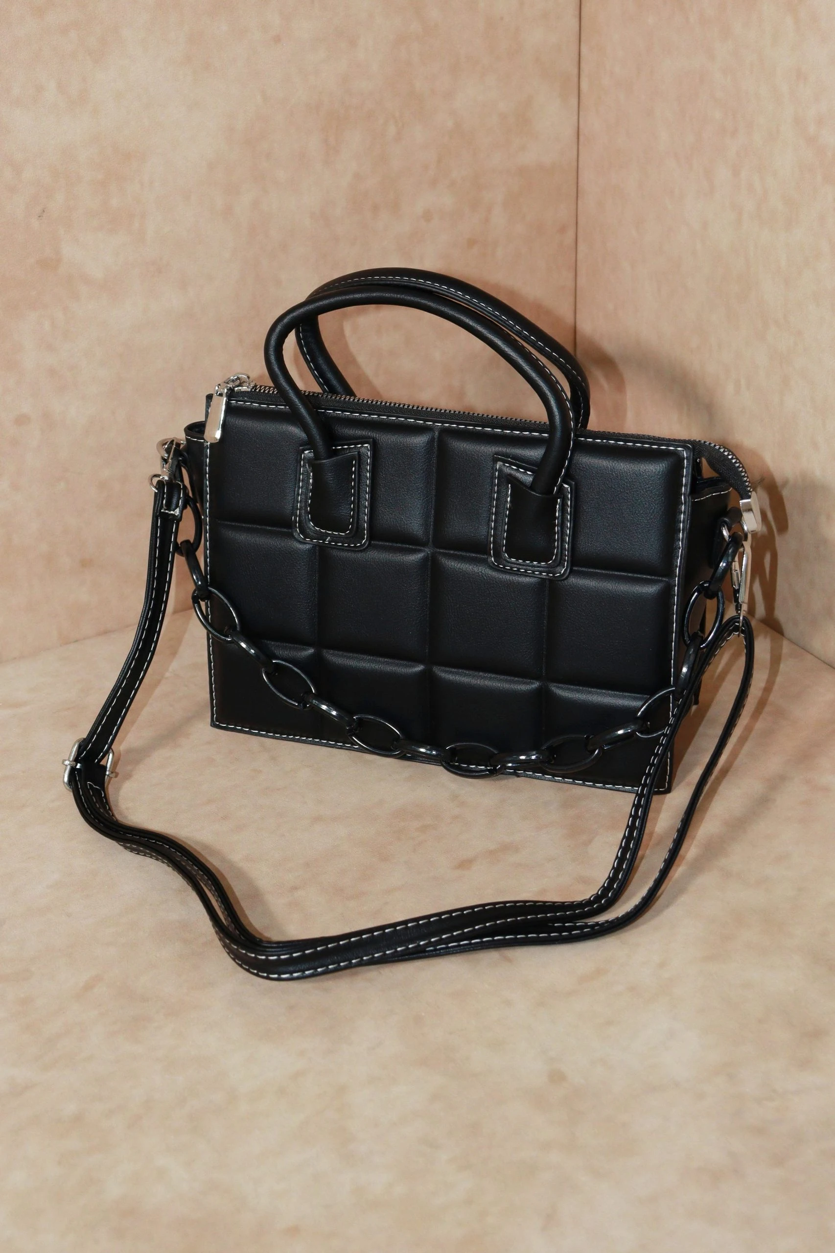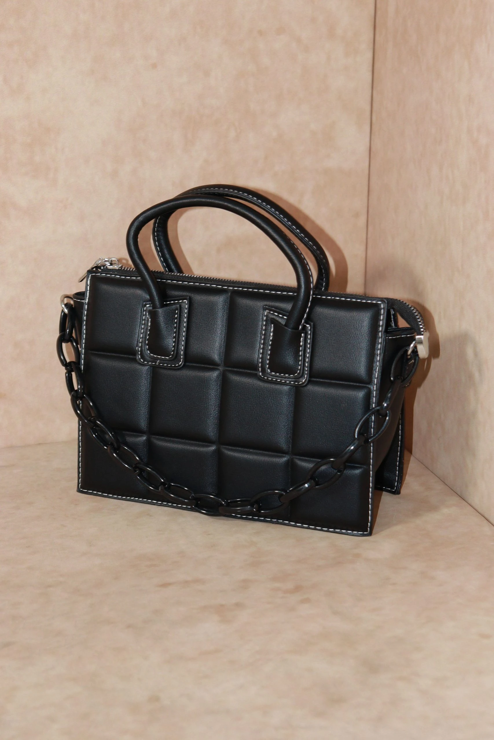 Only cool girl vibes allowed with this padded rectangle handbag. Featuring a coloured chain and contrast stitch it will add an edge to any outfit!