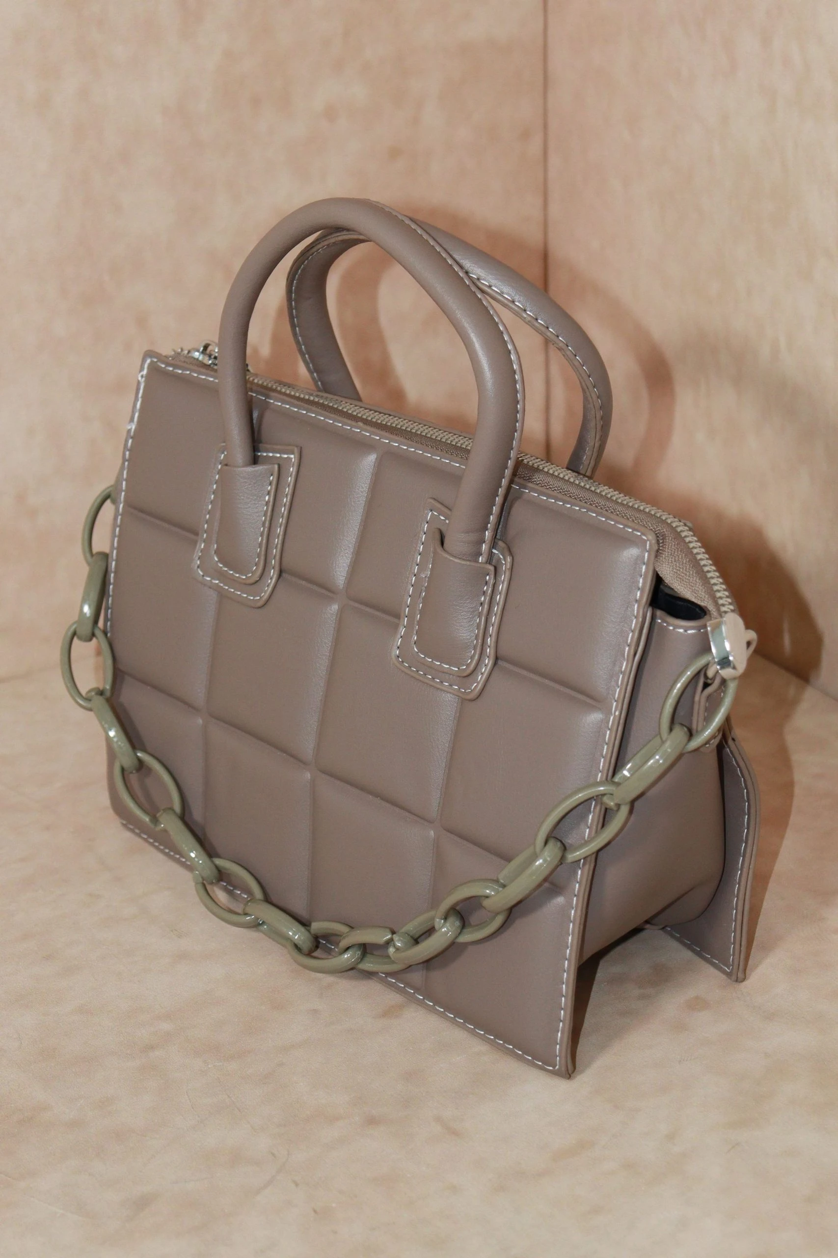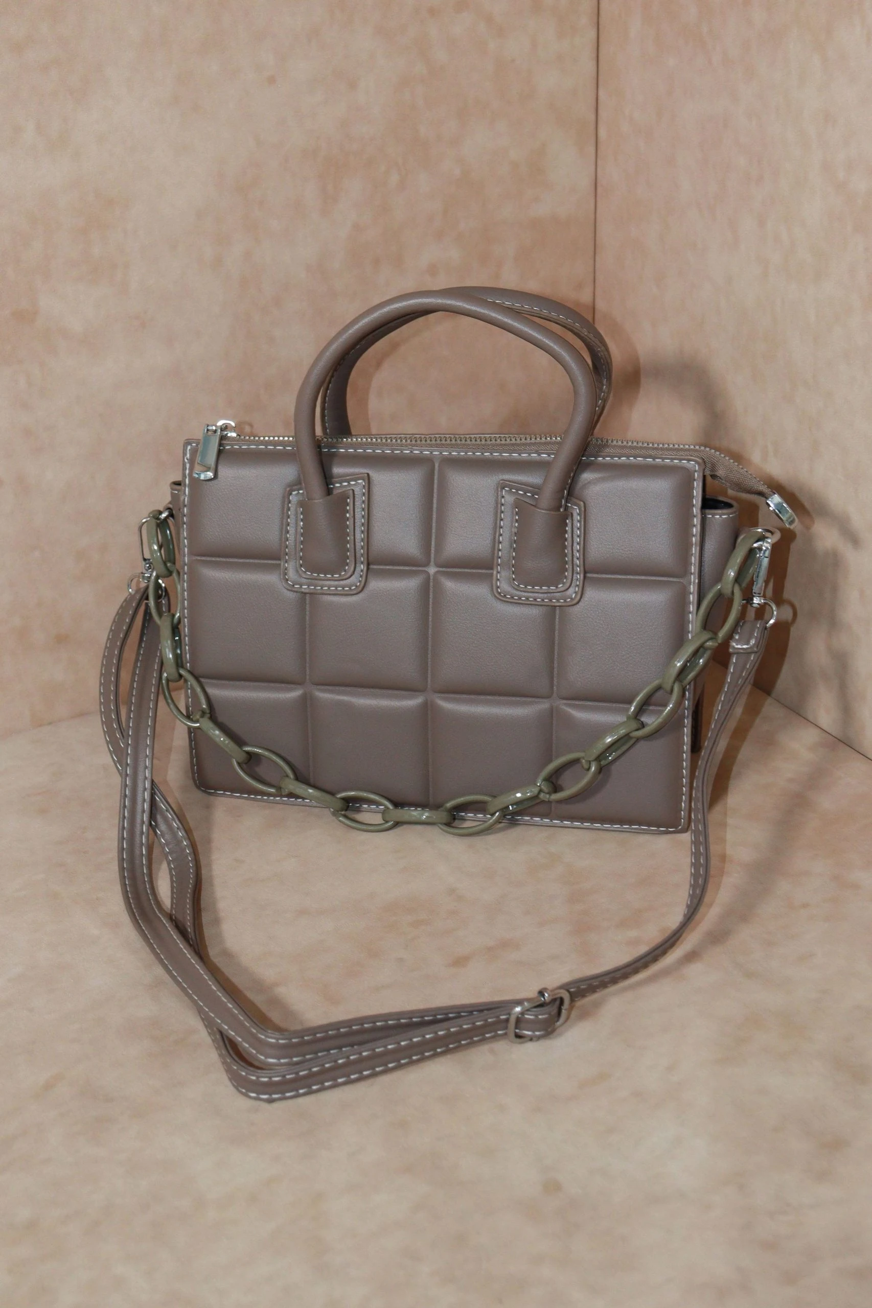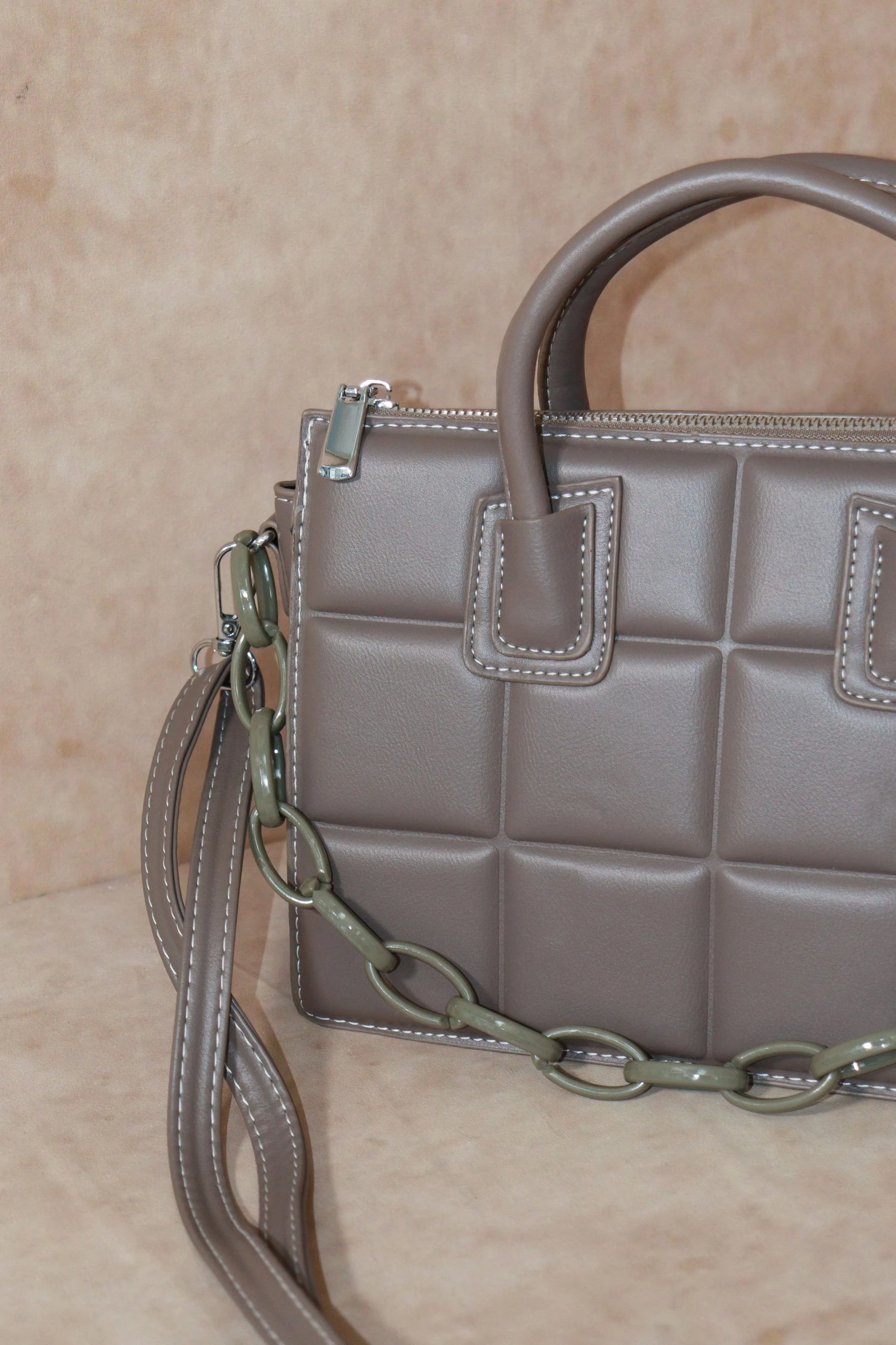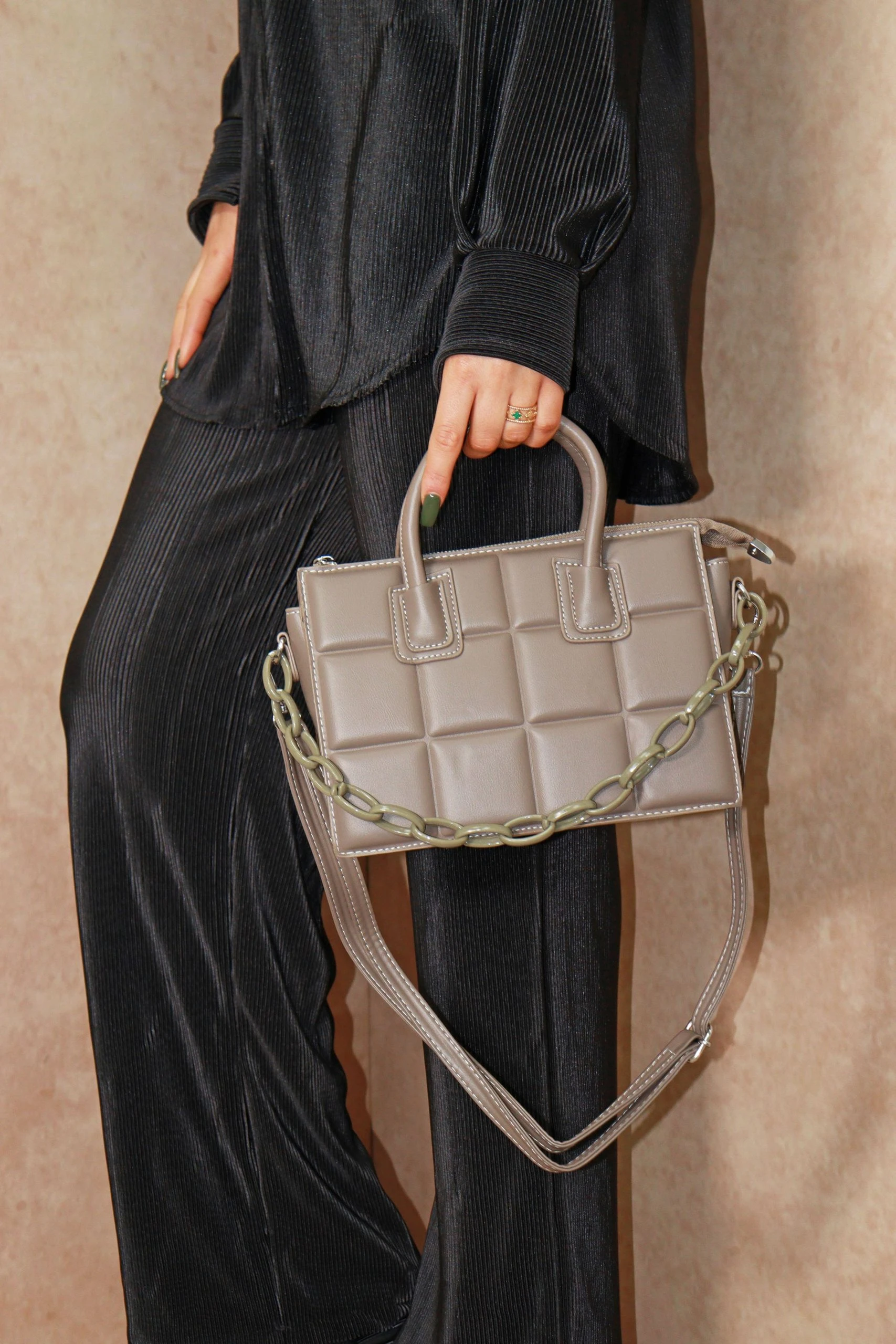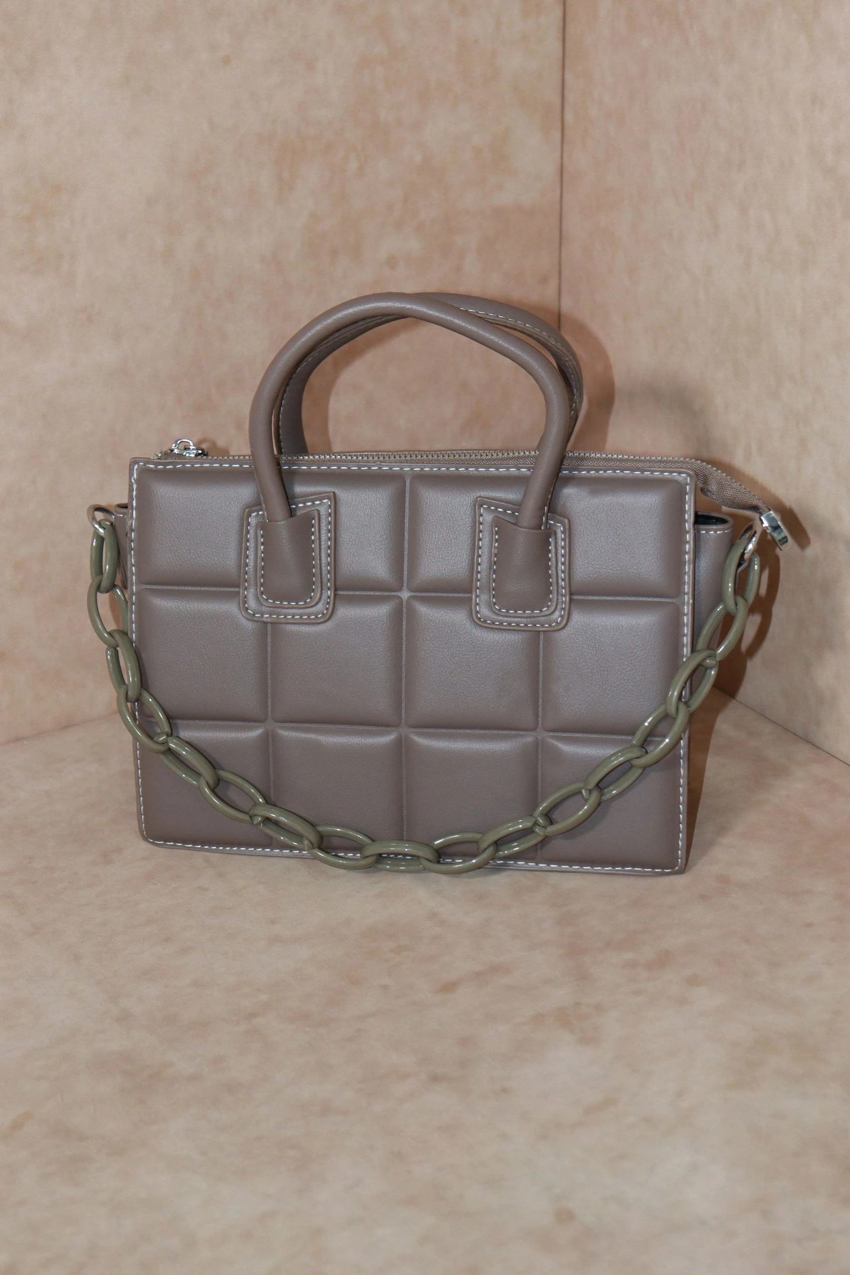 Only cool girl vibes allowed with this padded rectangle handbag. Featuring a coloured chain and contrast stitch it will add an edge to any outfit!