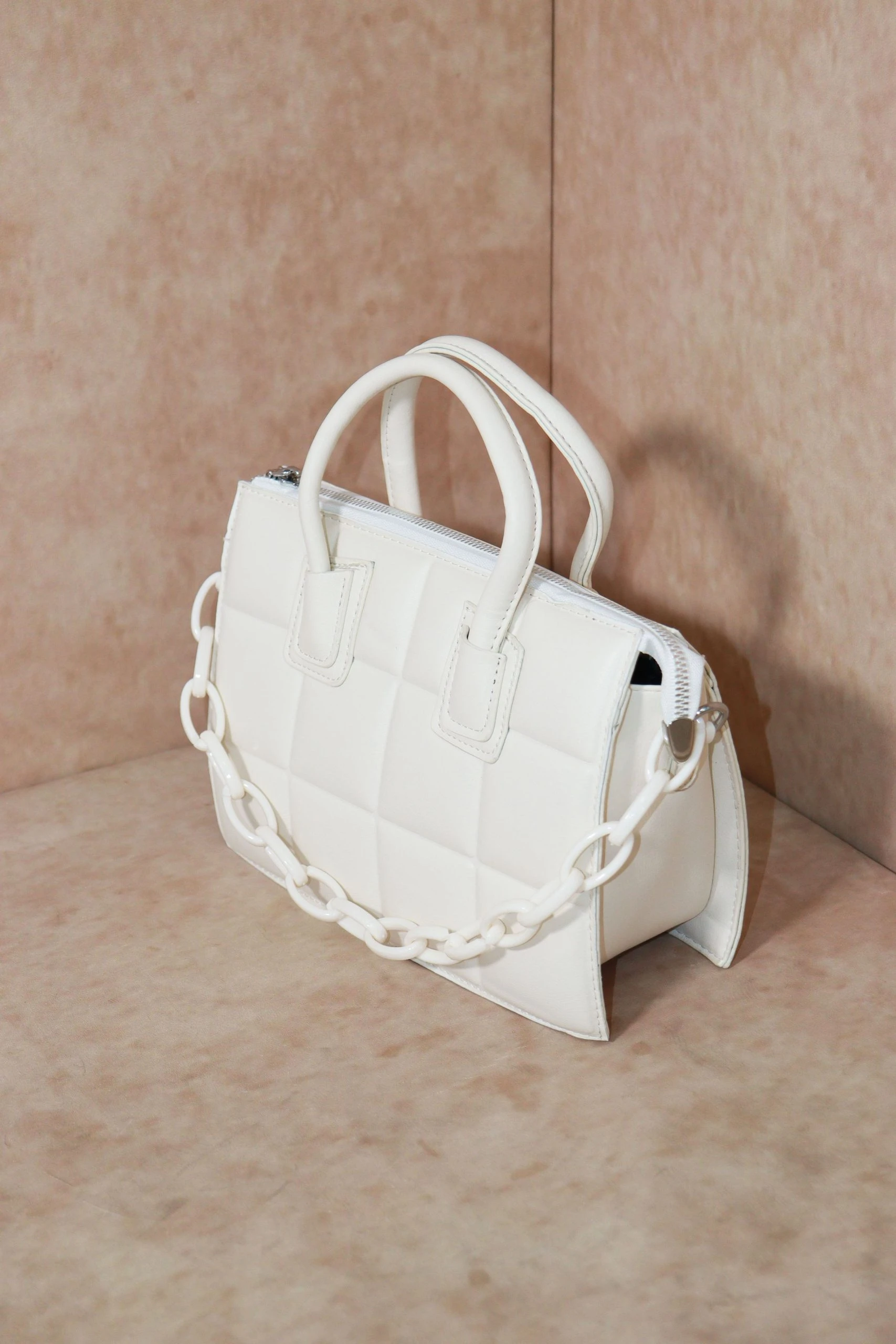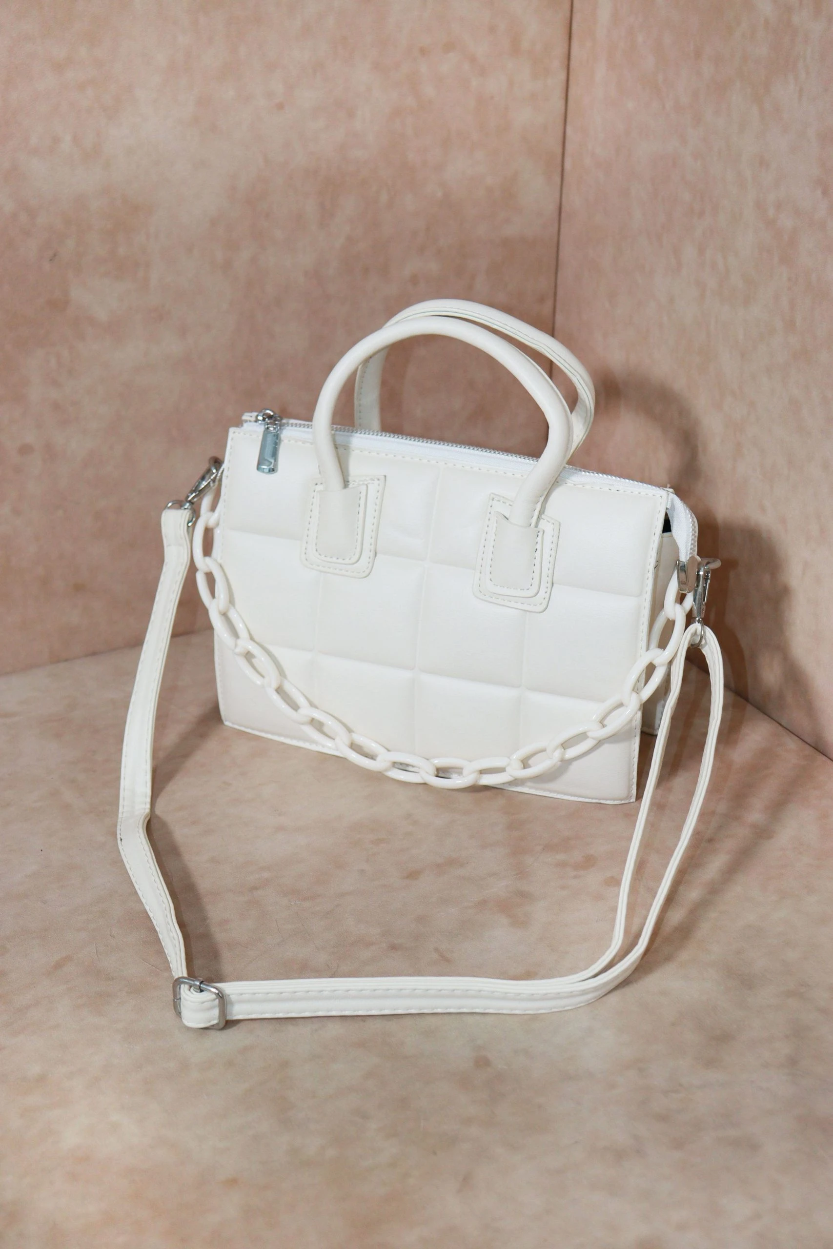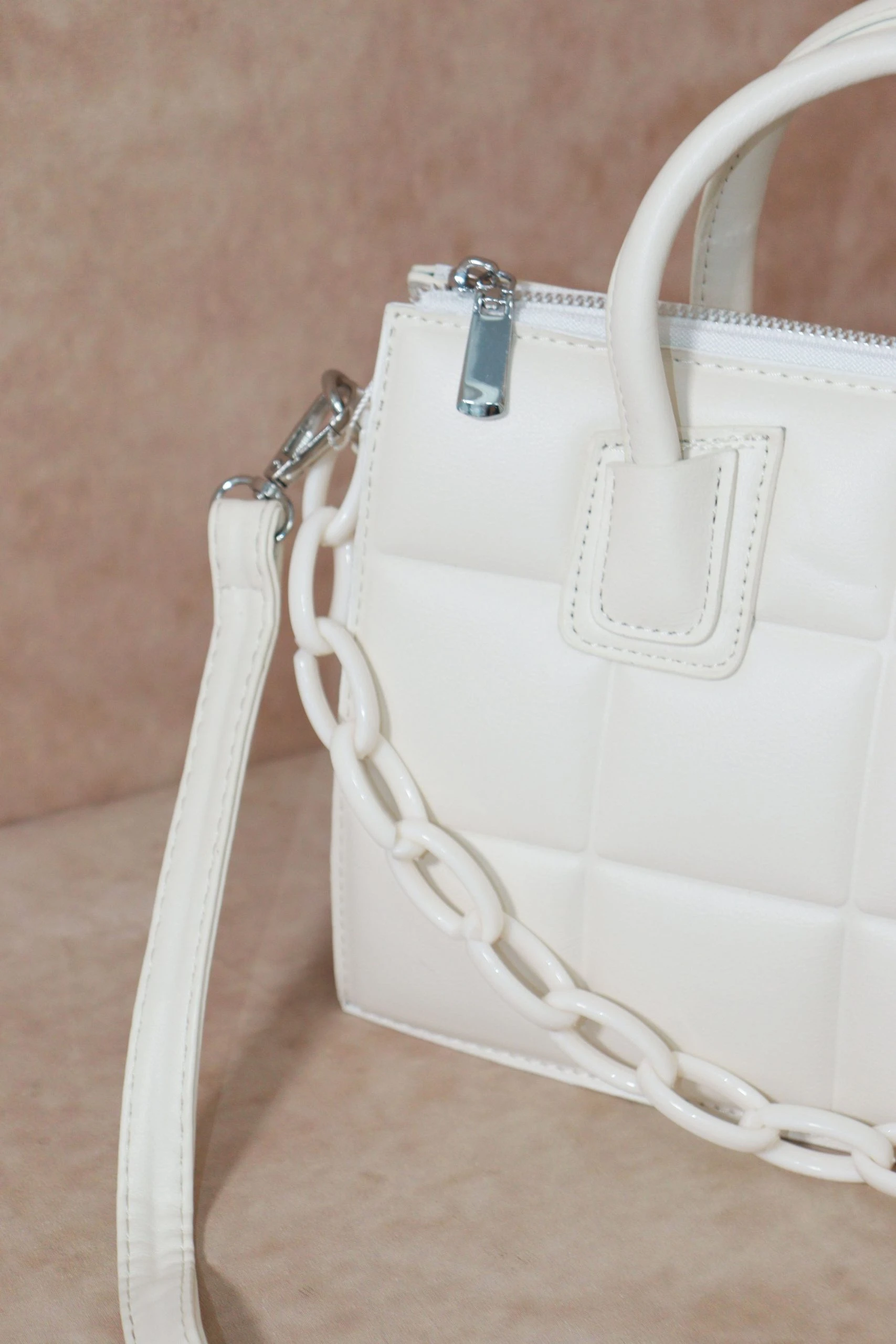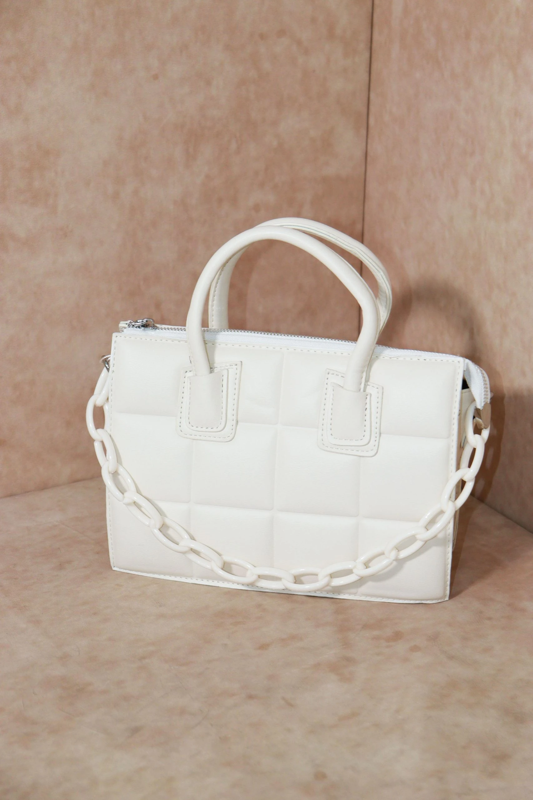 Only cool girl vibes allowed with this padded rectangle handbag. Featuring a coloured chain and contrast stitch it will add an edge to any outfit!