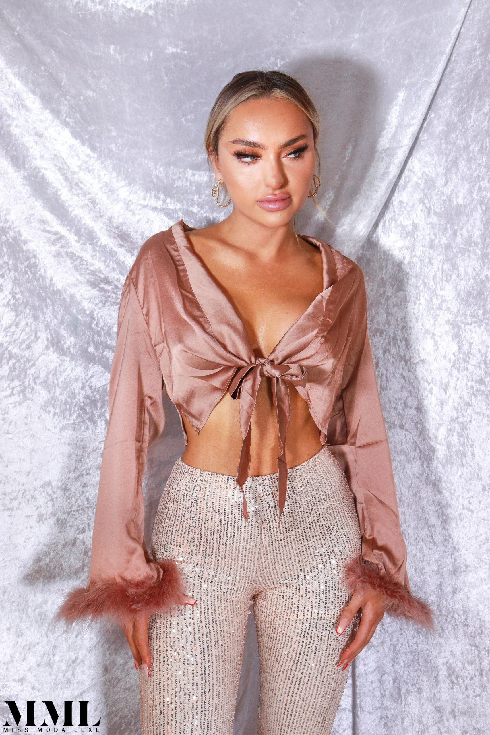 Say hello to the festivities with luxurious feather cuffed satin tie shirt babe. Featuring a rich satin material, tie detailing and feather cuffed sleeves this shirt is a party season must have. Pair with leather trousers or casual jeans for that perfect ‘jeans and a nice top’ look, you need this shirt muse!