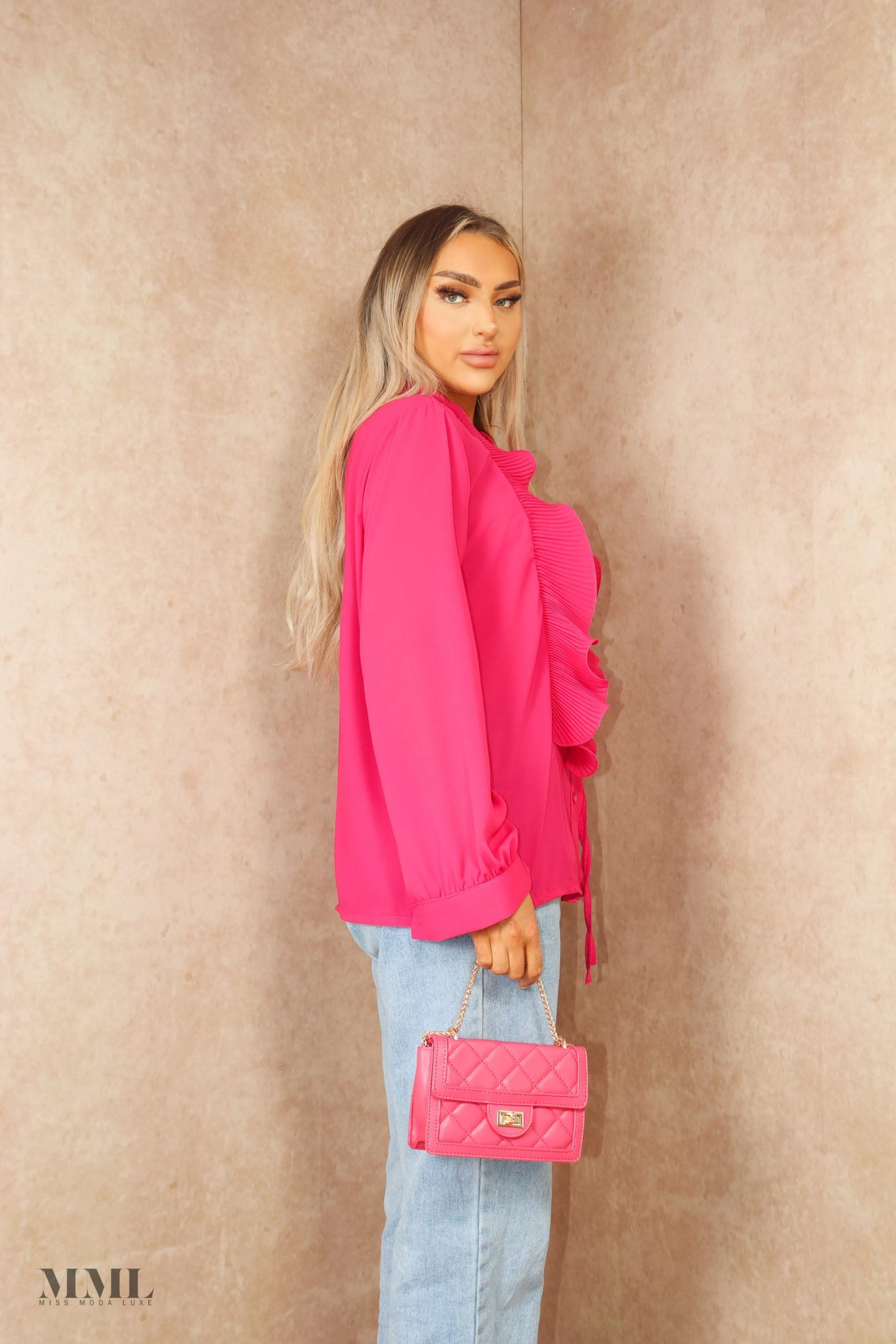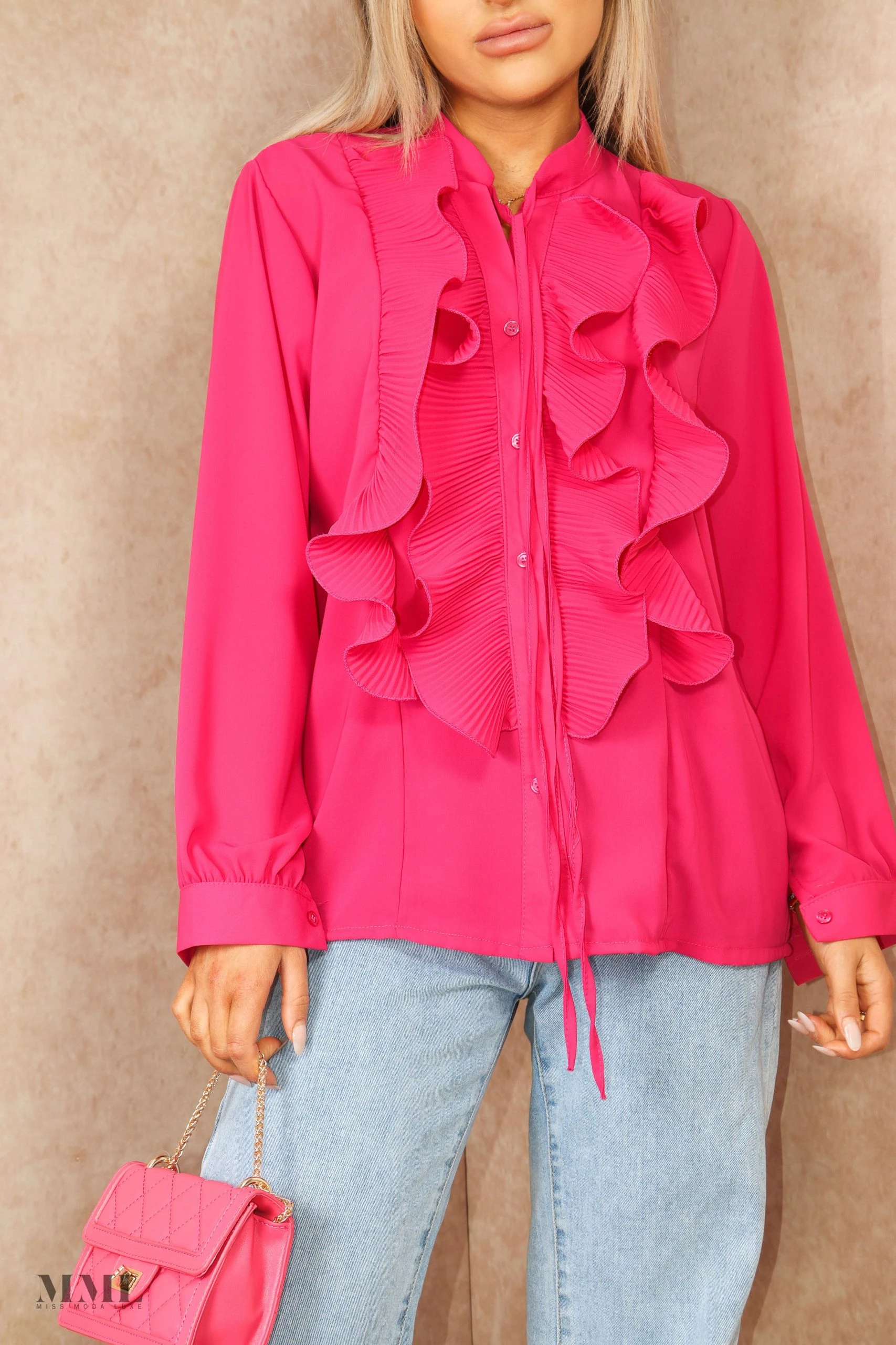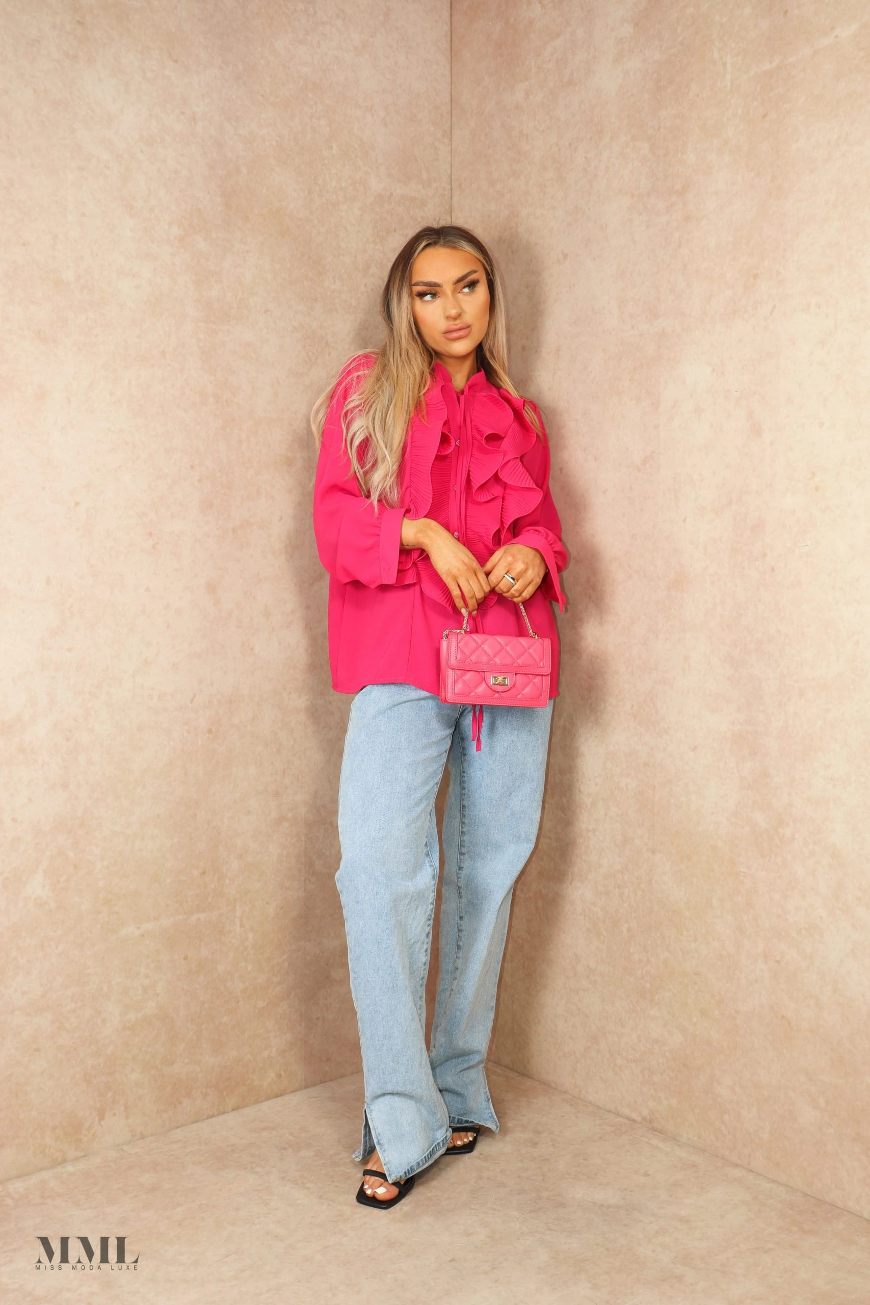 Step up your winter wardrobe with this must have frill detailed button up blouse doll. Featuring a frill ruffle collar detailing, button up and a slim fit we cant get enough! Style with a pair of our Leather PU shorts and boots for a look we love.