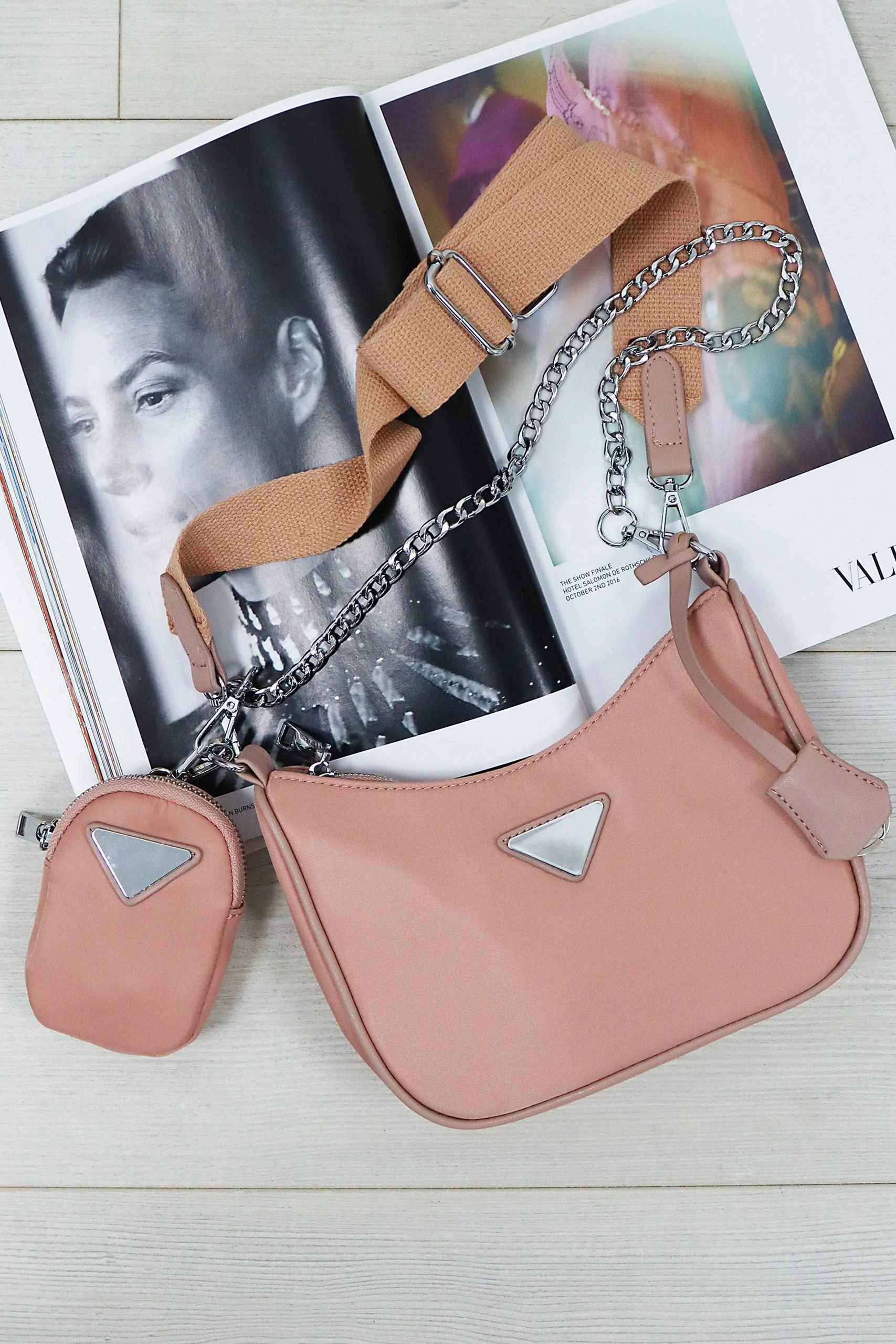 Give your everyday look an edge with this cross body, pocket detail bag. Featuring both an adjustable thick cross body strap and silver chain shoulder strap, nylon finished material and a detachable purse pocket. Available in multiple colours.