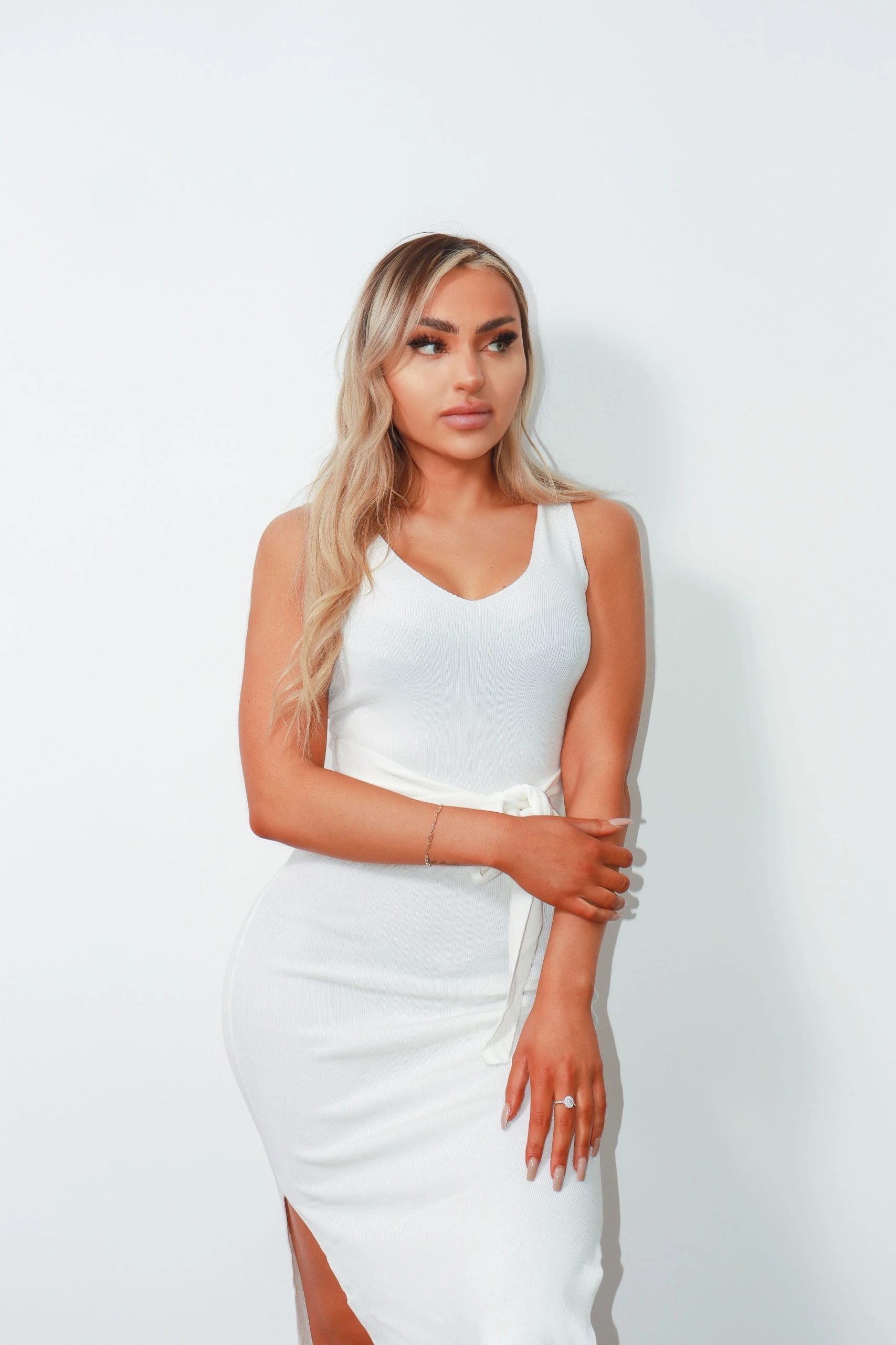 Level up your basics wardrobe with this must have ribbed dress doll. Featuring thick ribbed material, tie waist detailing and a midi length we cant get enough. Style with our new fur handle bag and heels for a look we love.