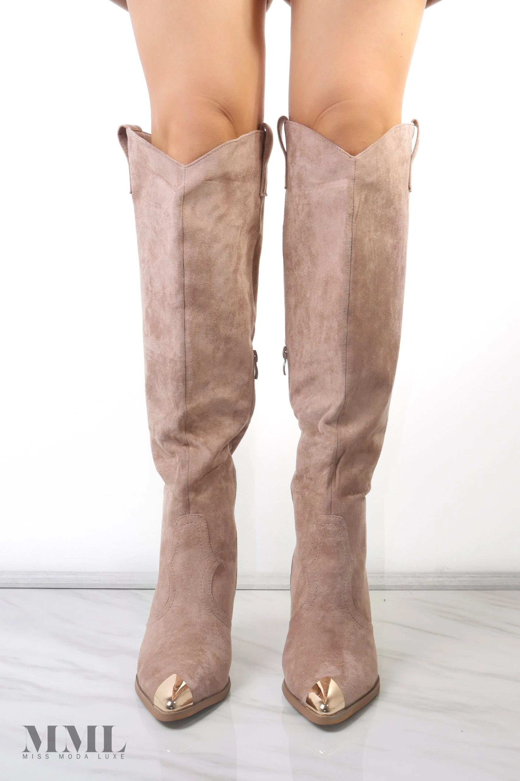 Get on trend with this seasons must have Knee High Faux Suede Cowboy Boots in a brand new style. These luxury western style boots are a must have for every wardrobe. Featuring a thick faux suede material, chunky heel and gold toe cap – we LOVE.