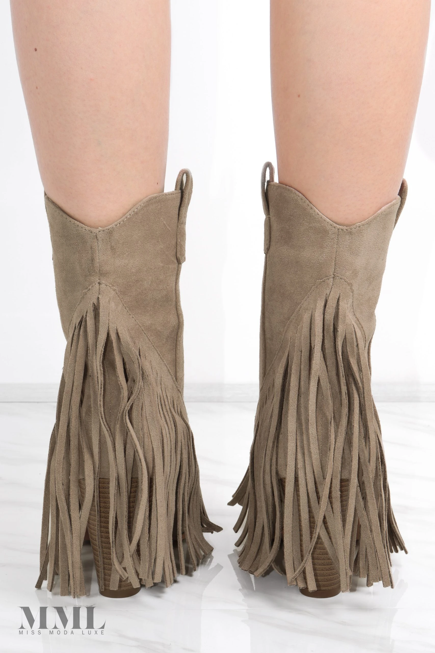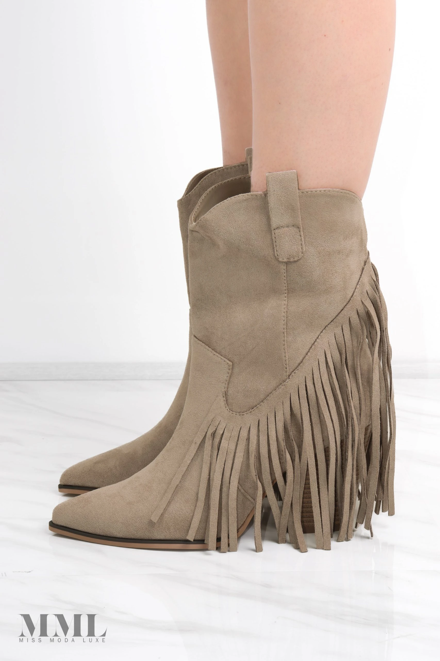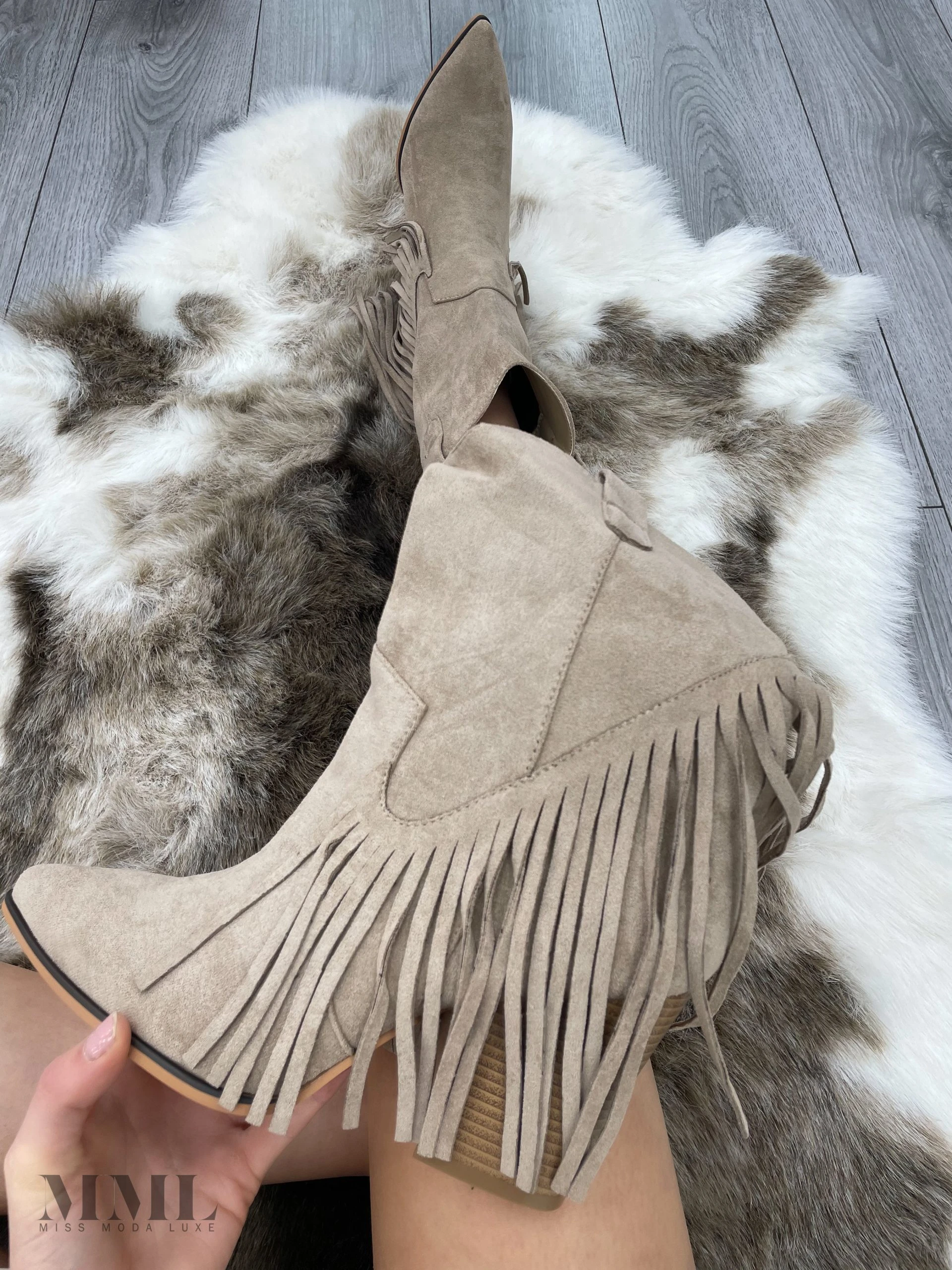 Next stop: your basket. These western style cowboy boots are the perfect play on the cowboy boot trend. Made from smooth vegan suede with fringing around the sides and back. Featuring an almond toe and pull tab fastenings.