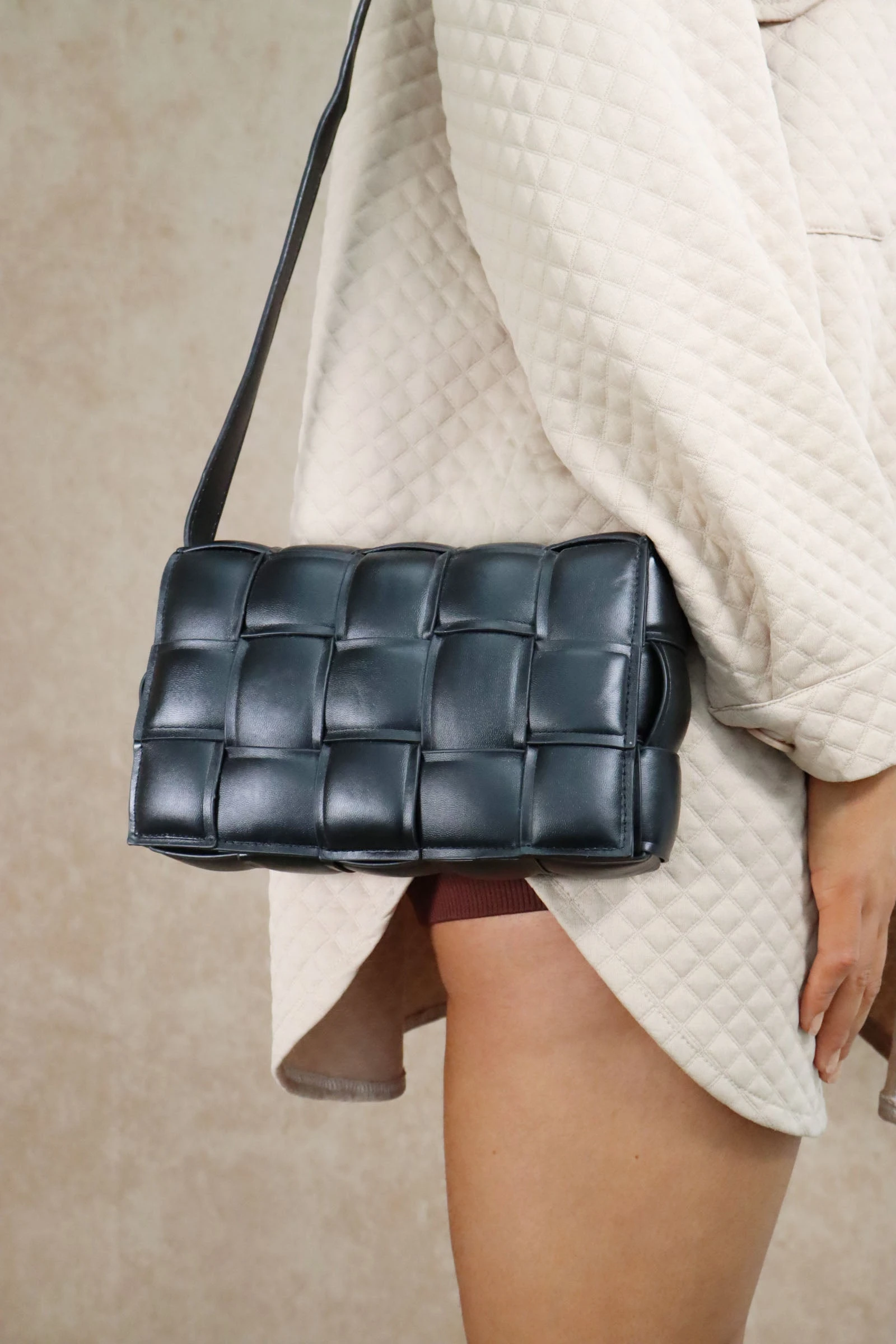The perfect bag for the transition from day to night, this faux leather woven clutch has additional gold detailing, zip pockets and a adjustable strap so can be worn as a cross the body or shoulder bag.