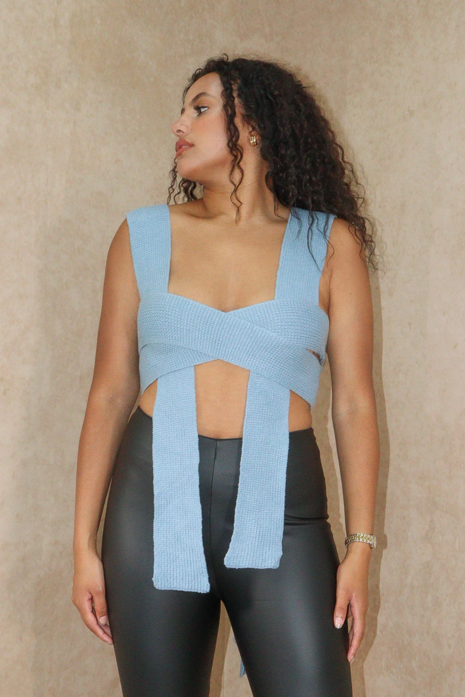 Get ready for date night in this luxe knit tie top. Featuring a thick knit material which can be worn in multiple ways, this is our ultimate go to style so on trend this season! Pair this with your go to jeans and heel for a glam finish.Â