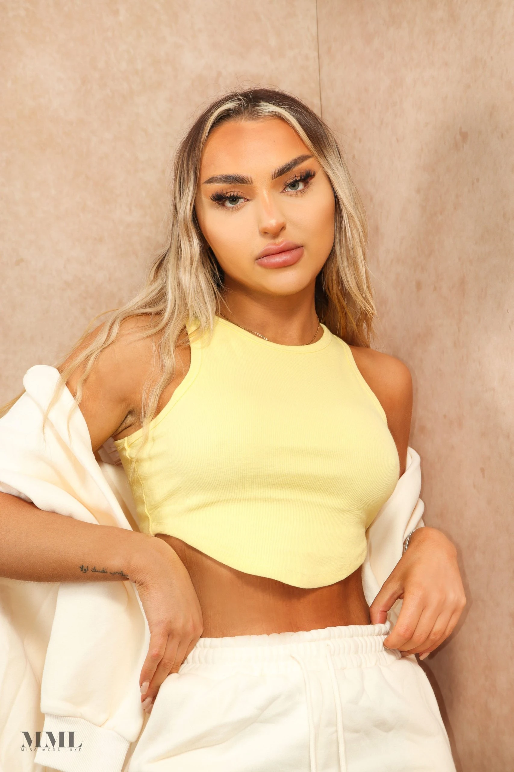 Level up your basics with this must have basic luxury ribbed racer vest crop top doll. Featuring a thick ribbed material, scooped neckline and high neck detailing every wardrobe needs this! Style with a classic pair of joggers or jeans for a casual look we love.