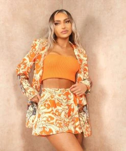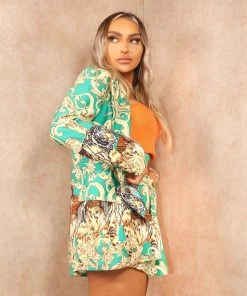 Miss Moda Luxe Black Geometric Print Ruched Sleeve Tailored Blazer