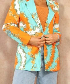 Miss Moda Luxe Turquoise And Orange Chain Multi Pattern Blazer